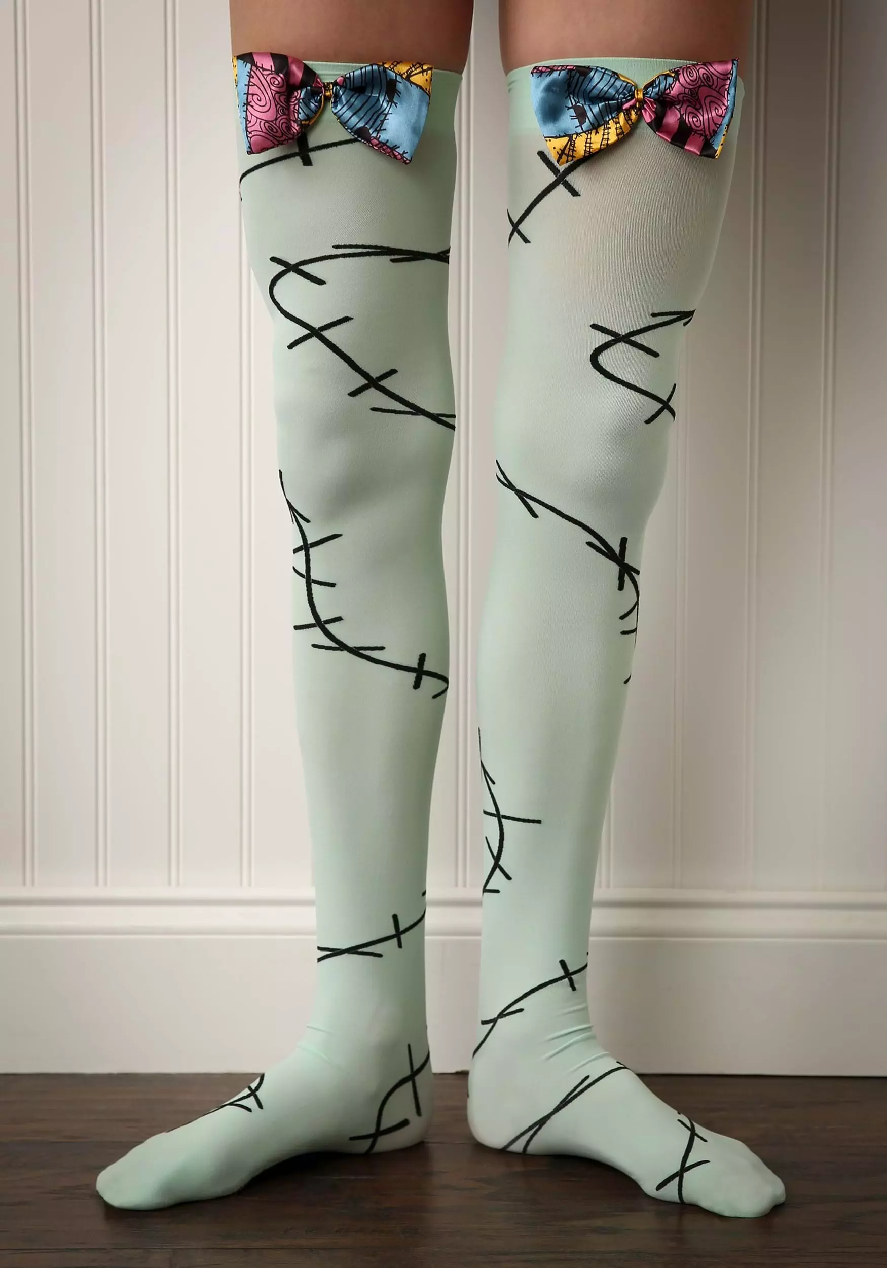 We sense something in the wind, telling you that these officially licensed Women’s Nightmare before Christmas Sally Over the Knee Socks are about to become your new favorite pair! The light green polyester-spandex socks are printed all over with a fun stitch pattern. The multicolored patchwork bows sewn to the tops are as pretty as Sally herself!