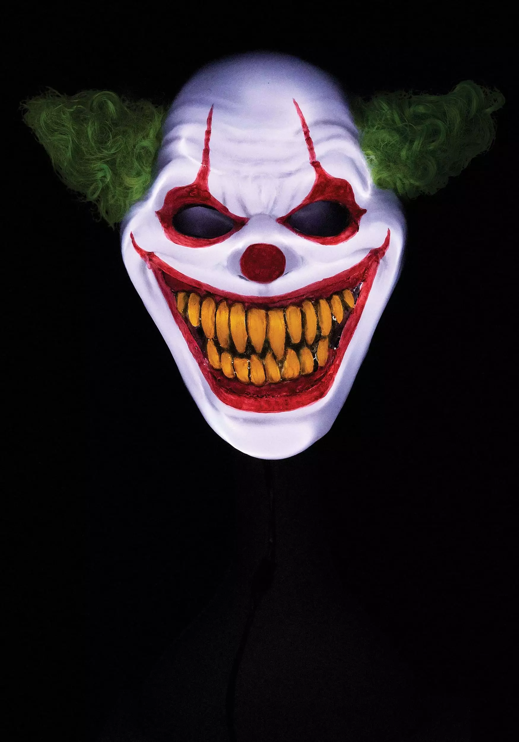 Terrify your local community in this Ha Ha Homicidal Adult Light Up Clown Mask! The mask’s bright paint and lime-green curly faux hair belies its hideously evil expression. The eyes and nose are outlined in a bloody-looking red, as is its mouth. Yellowed and blackened fang-like teeth protrude from its menacing leer. An elastic band keeps this monstrous masterpiece securely on your face, and two AA batteries will make it light up in the dark!