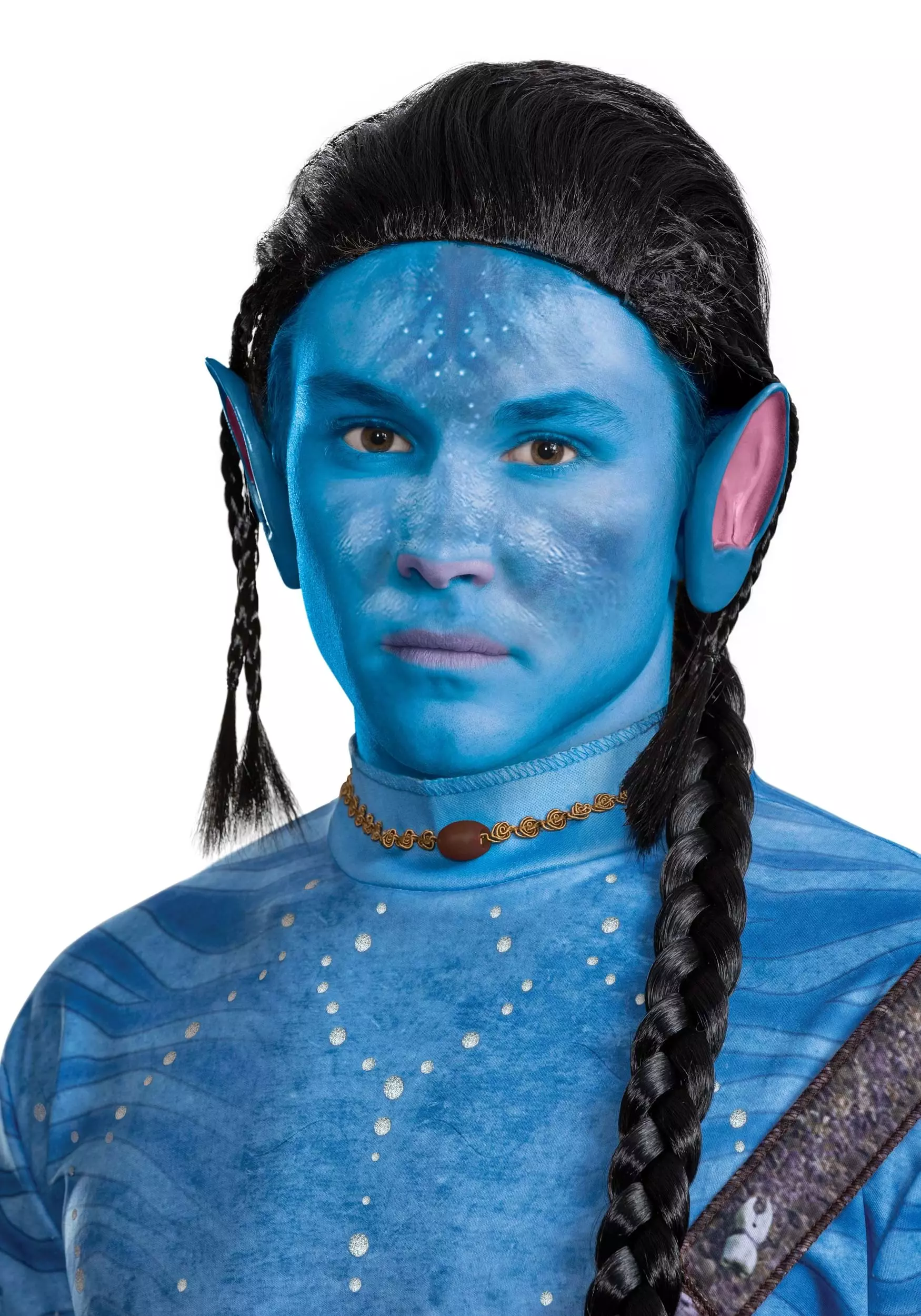 Defend your new home and people in this officially licensed Avatar Deluxe Jake Costume for Men! The long-sleeved jumpsuit is printed all over with a pattern of dark blue stripes and white dots on a light blue background to simulate Na’vi skin tone. The knees and arms are printed with tattoo markings and a faux leather sash is sewn across the chest. A brown loincloth with an attached tail can be tied around your waist. Add the braided wig and the brown gauntlet before leaving base!