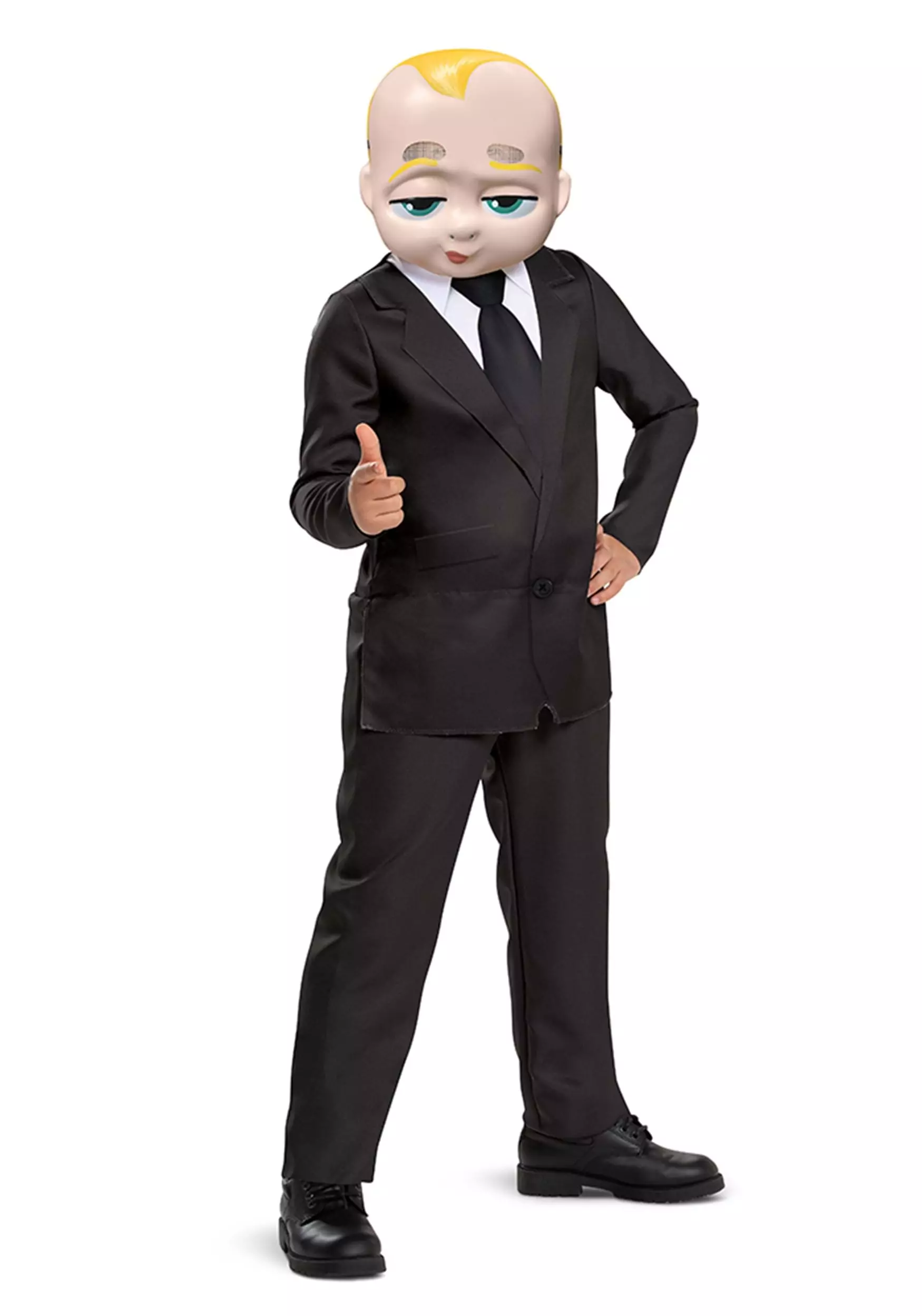 If your child thinks that they might like being in charge one day, then this costume can help them start getting precious experience early. In management, half the battle is looking the part, and this slim black suit will help them do it. The molded plastic, baby-head mask will help your child look youthful so that they are sure to fit in with the younger employees too!