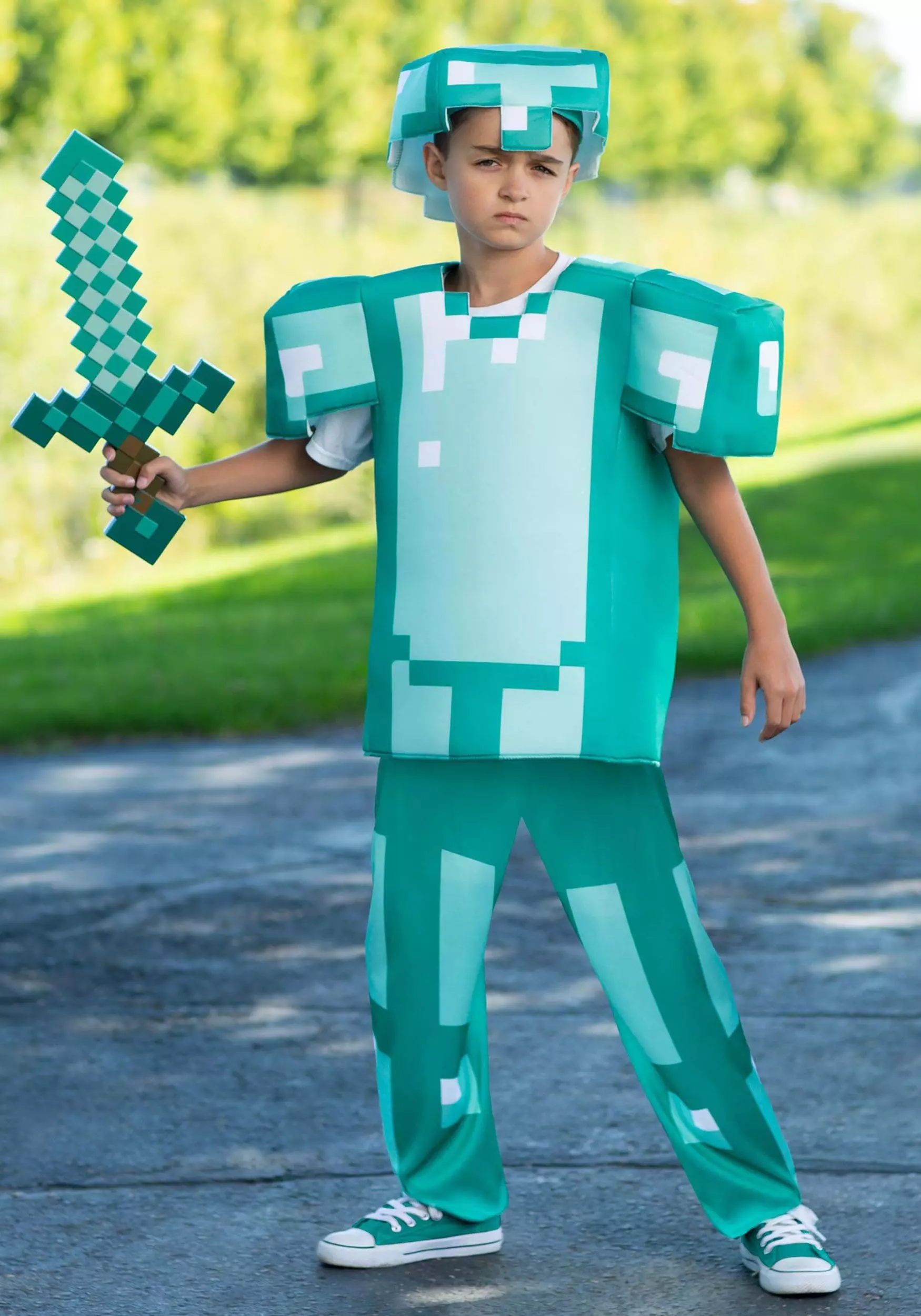 The diamond armor costume is modeled after the classic armor seen in Minecraft. It comes with a 3D constructed top, a pair of pants and a headpiece. It’s not made of real diamonds (which would probably be pretty heavy to lug around). Instead, it’s made out of fabric and foam, which means it’ll be easy for your child to wear as he explores the biome of your neighborhood! Just make sure you arm your child with a Minecraft weapon or two in case he bumps into a Creeper out there!