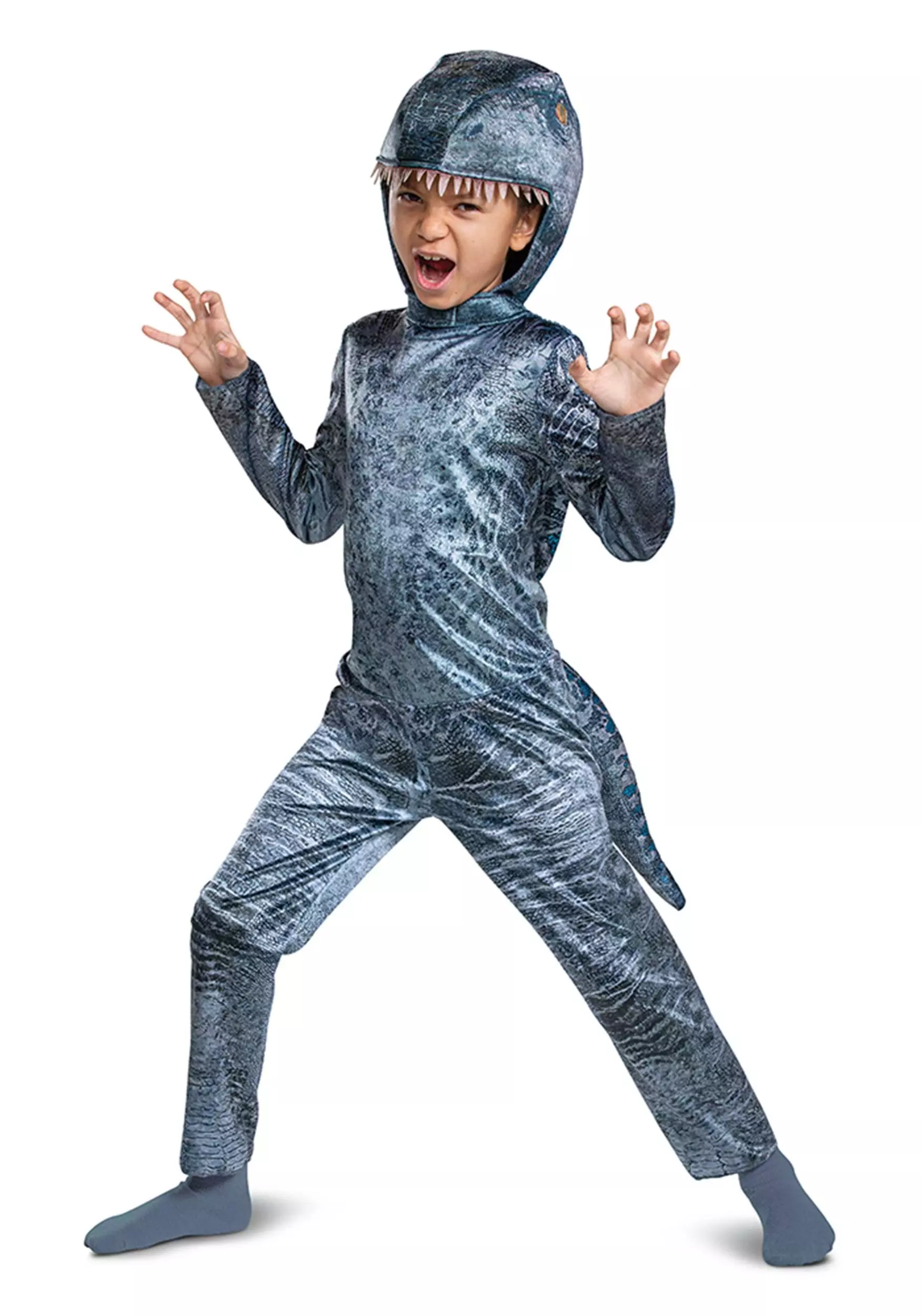 This Blue velociraptor costume will make your kid feel like they’re straight out of the movie Jurassic World! The suit secures up the back with strips of hook and loop fastener. A realistic, metallic blue pattern covers the whole jumpsuit as well as the headpiece and long tail in the back. Perfect for playing pretend and trick-or-treating, this Jurassic World costume is sure to be your kid’s favorite!