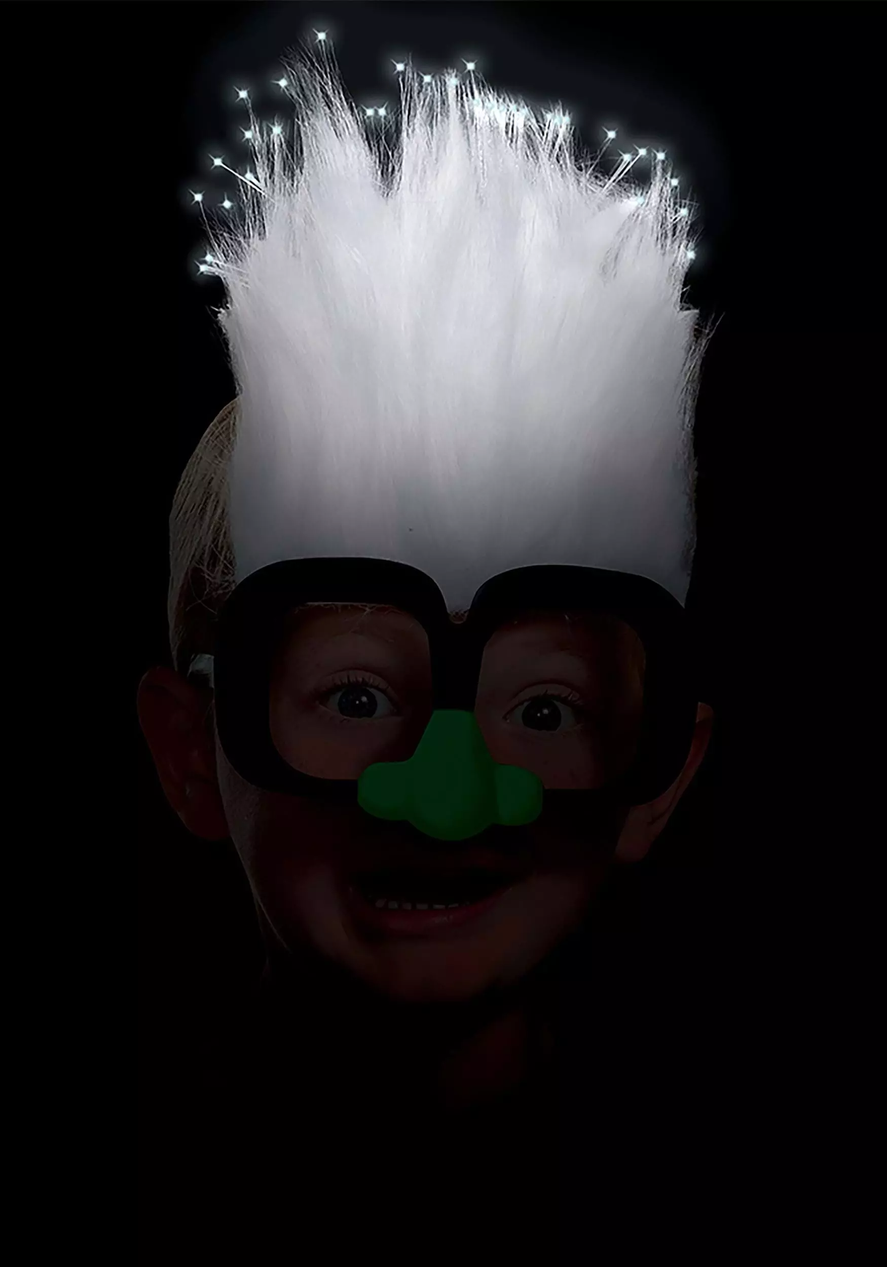 This officially licensed headpiece consists of eyeglass frames with attached hair. The oversized plastic frames are made with no lenses. There is also a green plastic nose attached to the center of the frames. The tuft of white faux hair is attached to the top edge of the frames. The hair has fiber optic strands intermixed that light up when activated. If you wish to activate those strands, you will need 3 AG10 button batteries. However, demo batteries are included.