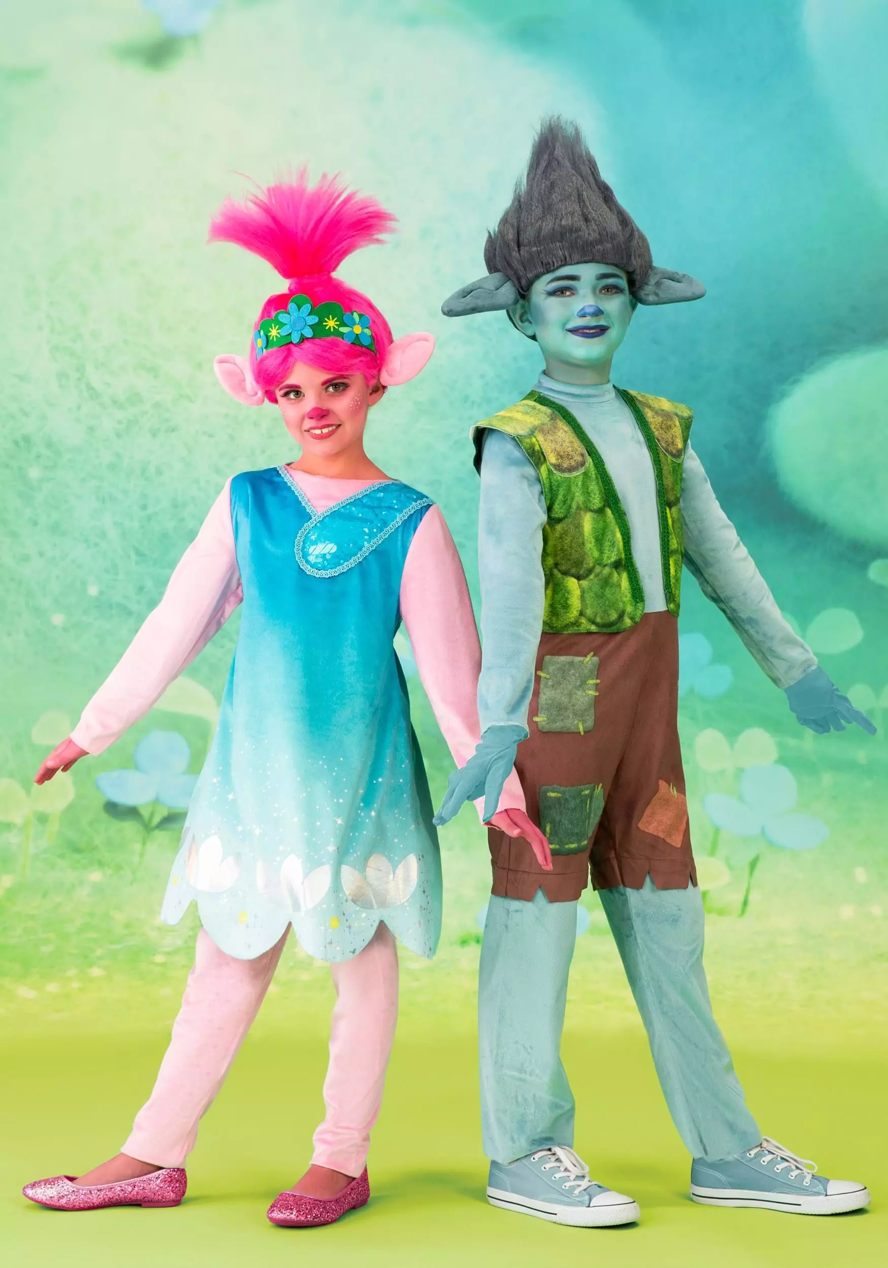 This officially-licensed Poppy costume from Trolls World Tour is all about the sparkle and color! The included dress is a sparkly velour with a soft petal-style hemline and is attached to pink sleeves for a a faux pink skin tone without the need for makeup. It’s layered over a ruffled petticoat for some serious twirl-factor. Pink leggings continue your kiddo’s pink skinned disguise. Of course, this wouldn’t be a Troll costume without the trademark spikey colorful hair. Accented with a flower crown and big ears, this pink wig will bring your kid’s Poppy persona to sparkly, musical life!