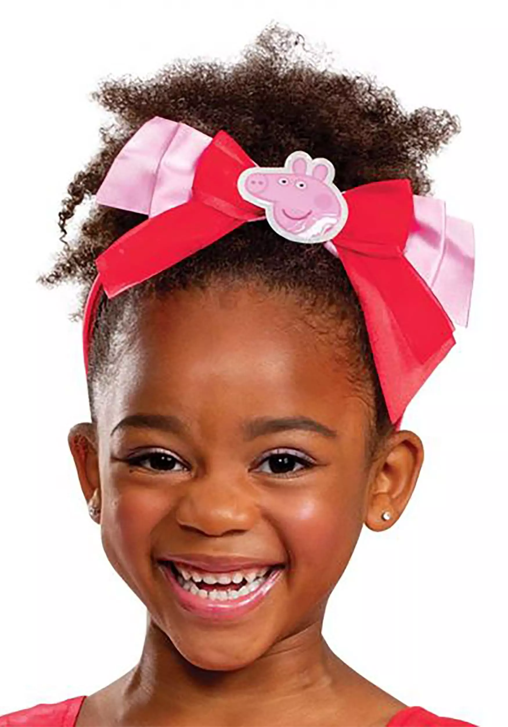 This costume starts with a bright pink dress with Peppa Pig right on the front. It also has a pink, satin bow around the waist, and a skirt with layers of tulle. The satin accents on the edge of the skirt also add a playful pop of Peppa colors to the outfit. The pink tail attaches to the back of the dress, so your child can wear it off or on! Finally, the costume comes with a headband, which has Peppa Pig’s face right in the middle! It’s a great way to top off the whole look.