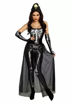 This costume really makes an entrance! It features a fitted tank top that’s printed with a ribcage and a spine. A long, sheer tulle skirt drapes from the hem for a dramatic look. A pair of black leggings is layered underneath and has leg bones printed on the front. The look is finished off with elegant elbow-length fingerless gloves that are also printed with bones. It’s topped with a headpiece that’s centered with a lightweight skull and black fabric flowers. This is a ghostly look that’s sure to make you one of the top haunters in your graveyard.