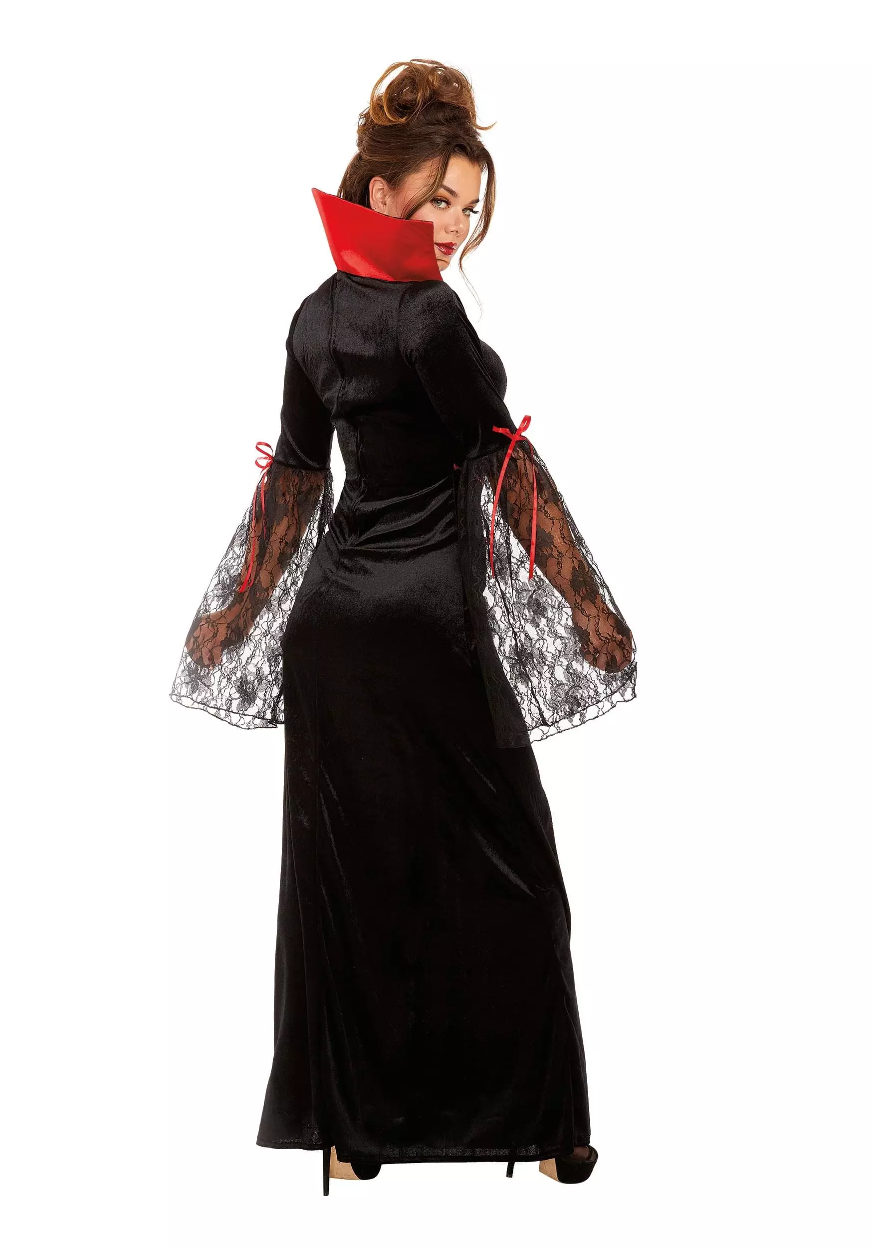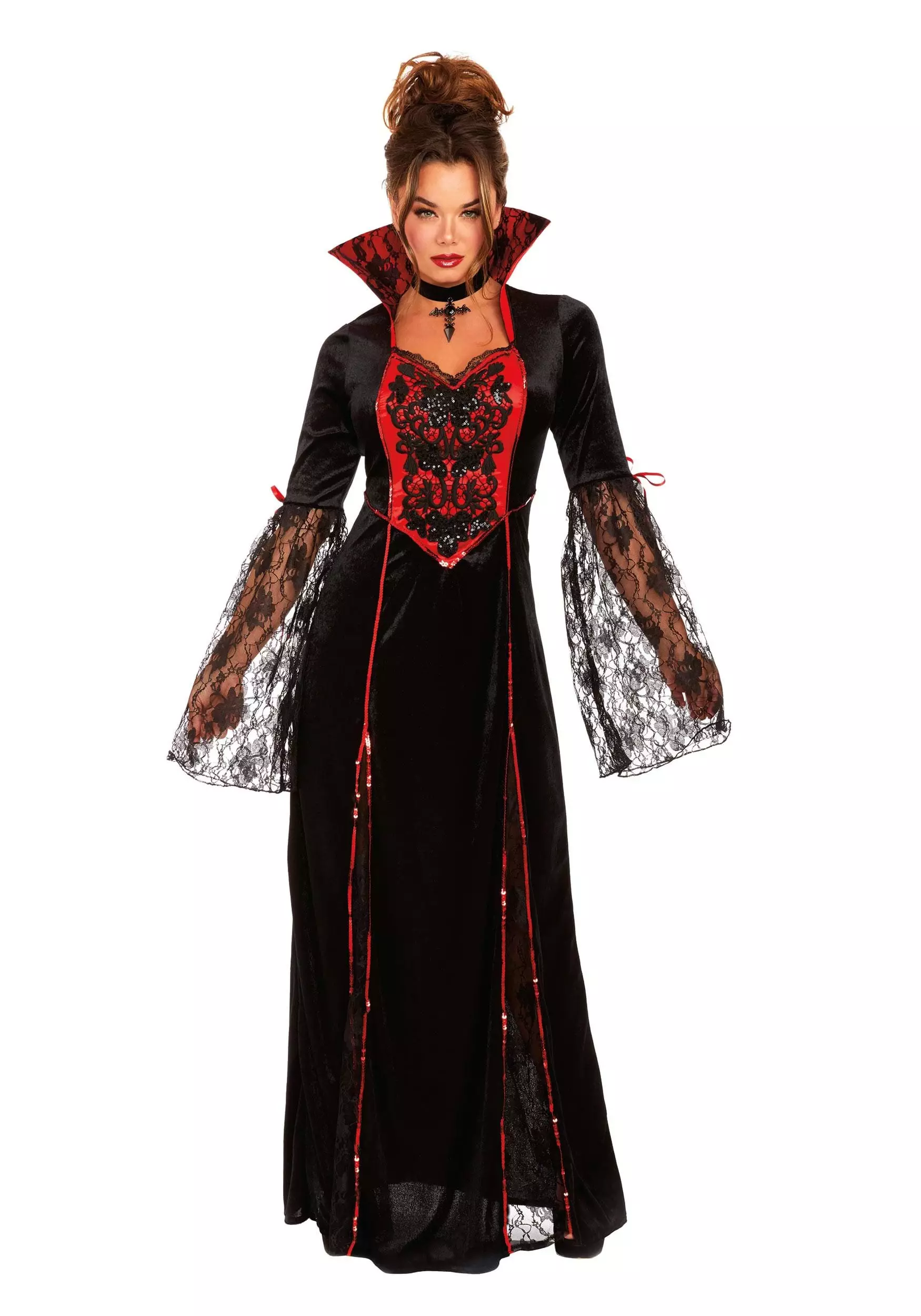 Just how transformative can a dress and necklace be? Slip this costume on and see for yourself! It’s a long, black, velour gown with a blood-red front bodice adorned in lace and sequins. The stiff satin collar has matching black lace detailing and the sleeves also boast black lace and red bow adornments. The skirt features thigh-high slits, lace inserts, and red sequin trim, while the included choker has a blackened metal cross set with a faux gem.