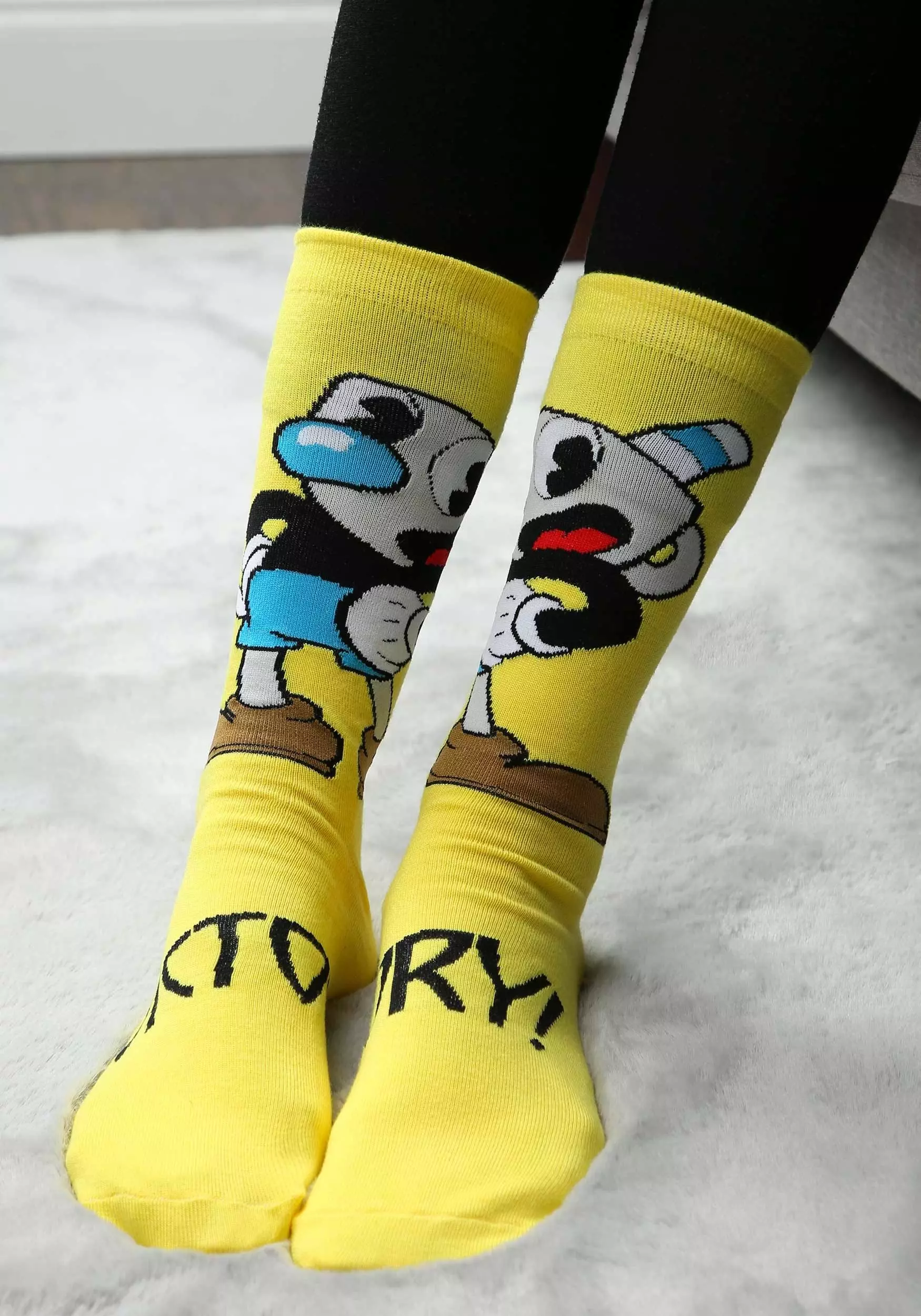 These bright yellow socks work as a team to make one complete picture. Put your ankles together to see Mugman with his hands on his hips, mouth open in a cheer. From his round blue nose to the cup handle poking out of the back of his head, every detail is in place. Underneath him, the word Victory! is spelled out across the tops of the feet. Turn them over to see Victory across the bottoms, too! With Mugman at your side (or at your shins), your day is sure to be a triumph!