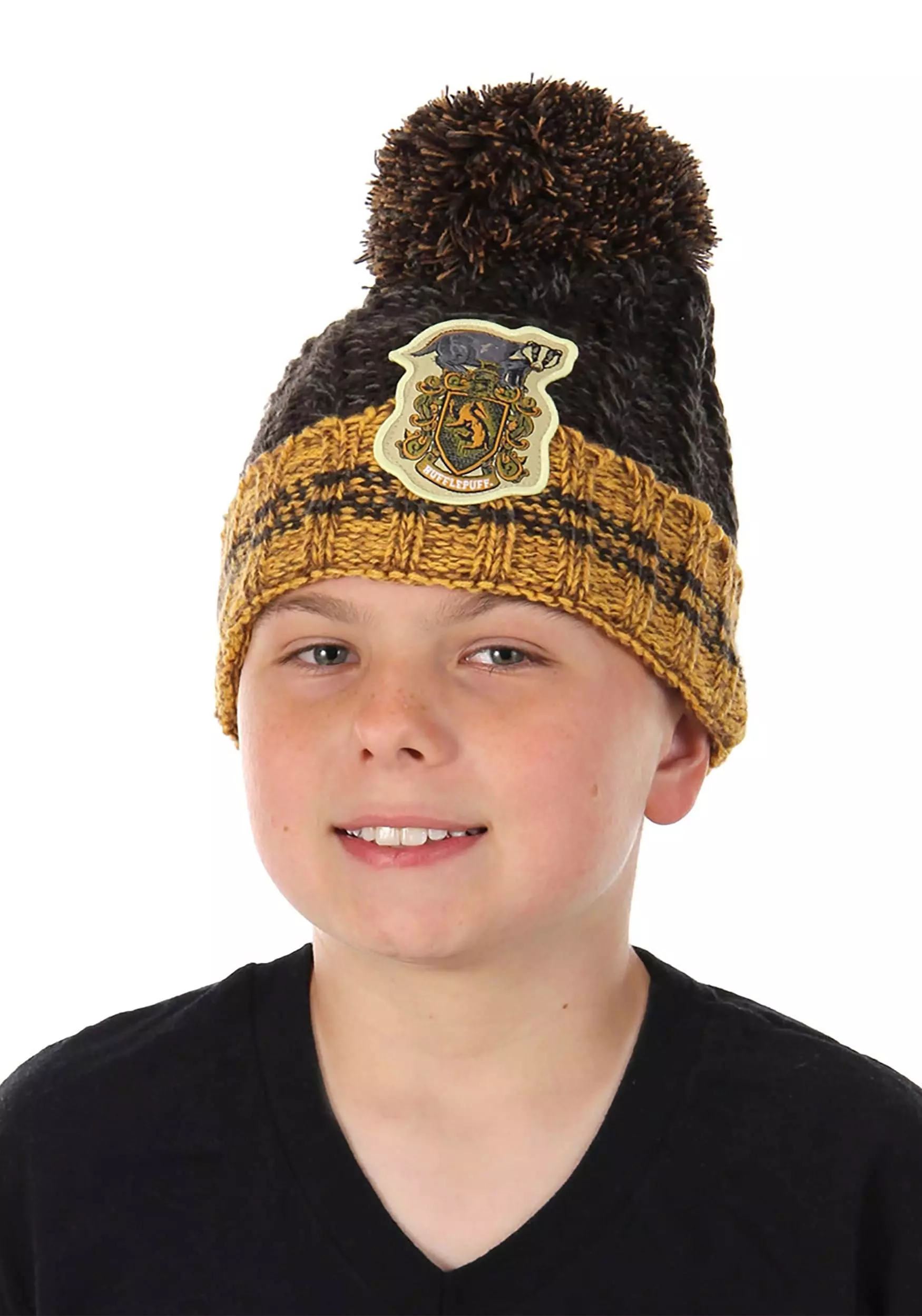 Prepare like a proper Hufflepuff when you order this officially licensed accessory for your wardrobe! The Made By Us exclusive starts with a heathered grey and yellow knit construction that looks as inviting as a homemade sweater. As if pulling on the idea of a room filled with plush pillows, the cozy hat is topped with a full and fluffy variegated pompom. Step easily into the winter-chilled halls, or grounds of Hogwarts school with the Hufflepuff crest proudly appliqued to the front of your hat. Sheltered under its lightweight, you’ll feel close to the comfort of the Hufflepuff burrow wherever you go!
