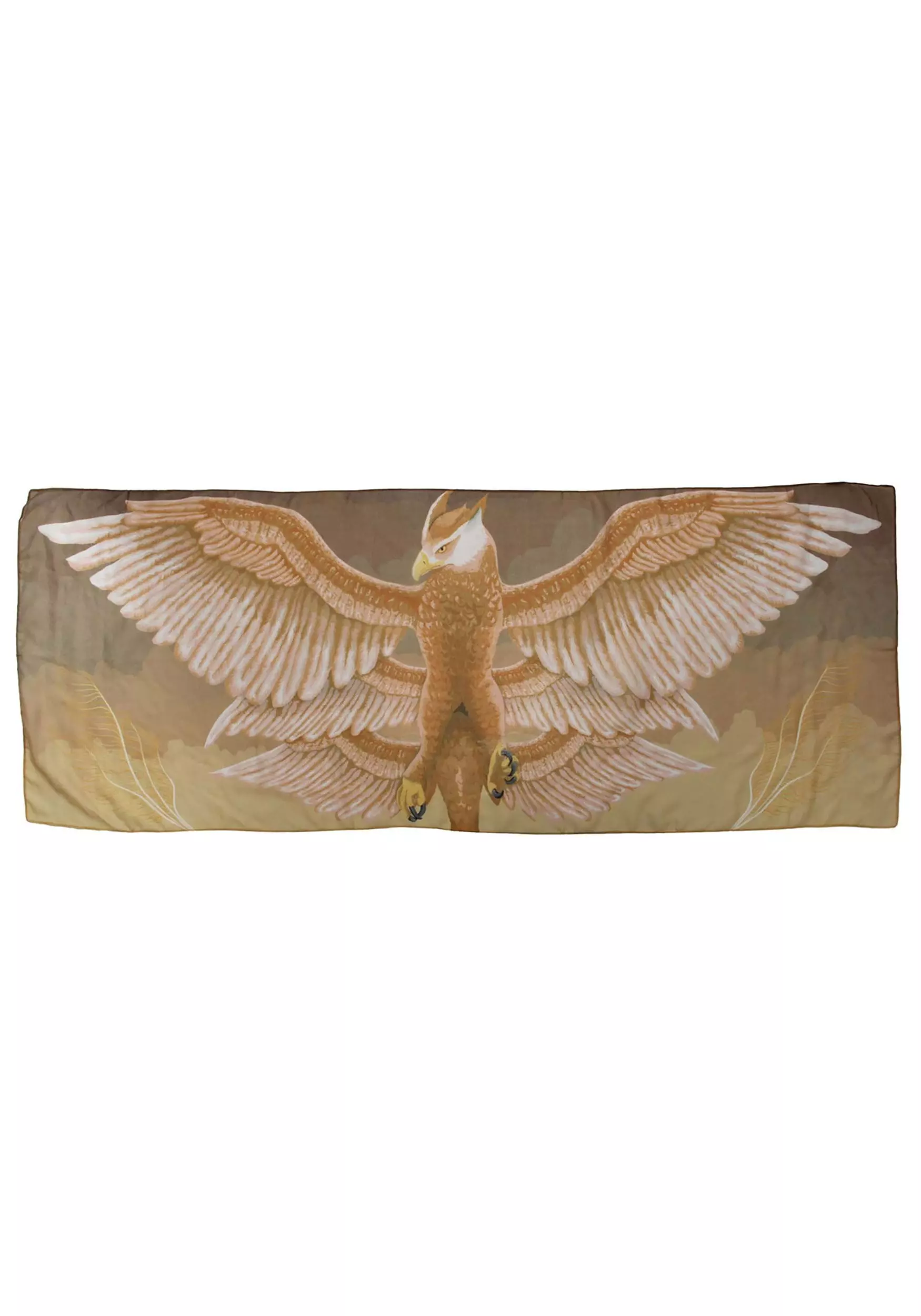 This sheer, gauzy scarf features a full body image of the majestic Thunderbird. With its two giant claws and large eagle’s head, it might at first be interpreted as an eagle. But those who look closer will see the three sets of wings along its back! With its powerful, magical wings, the Thunderbird can create storms, while their acute danger sense keeps them out of harm’s way. Members of the Thunderbird house are proud of their mascot, and they will wear this scarf with joy and pride!