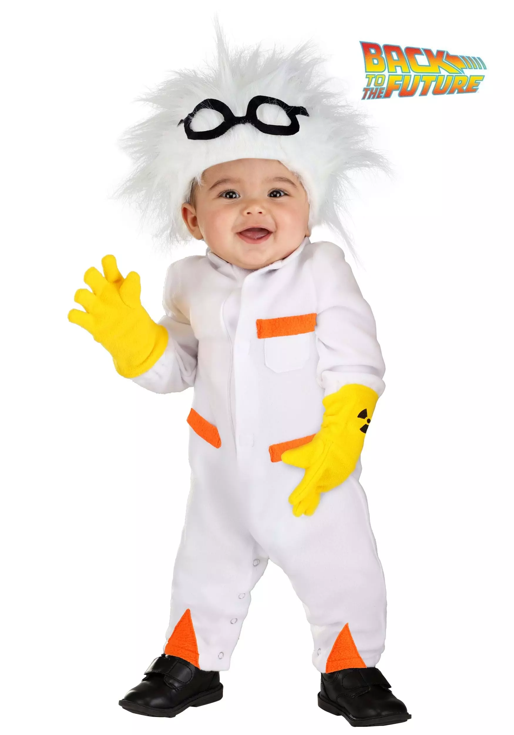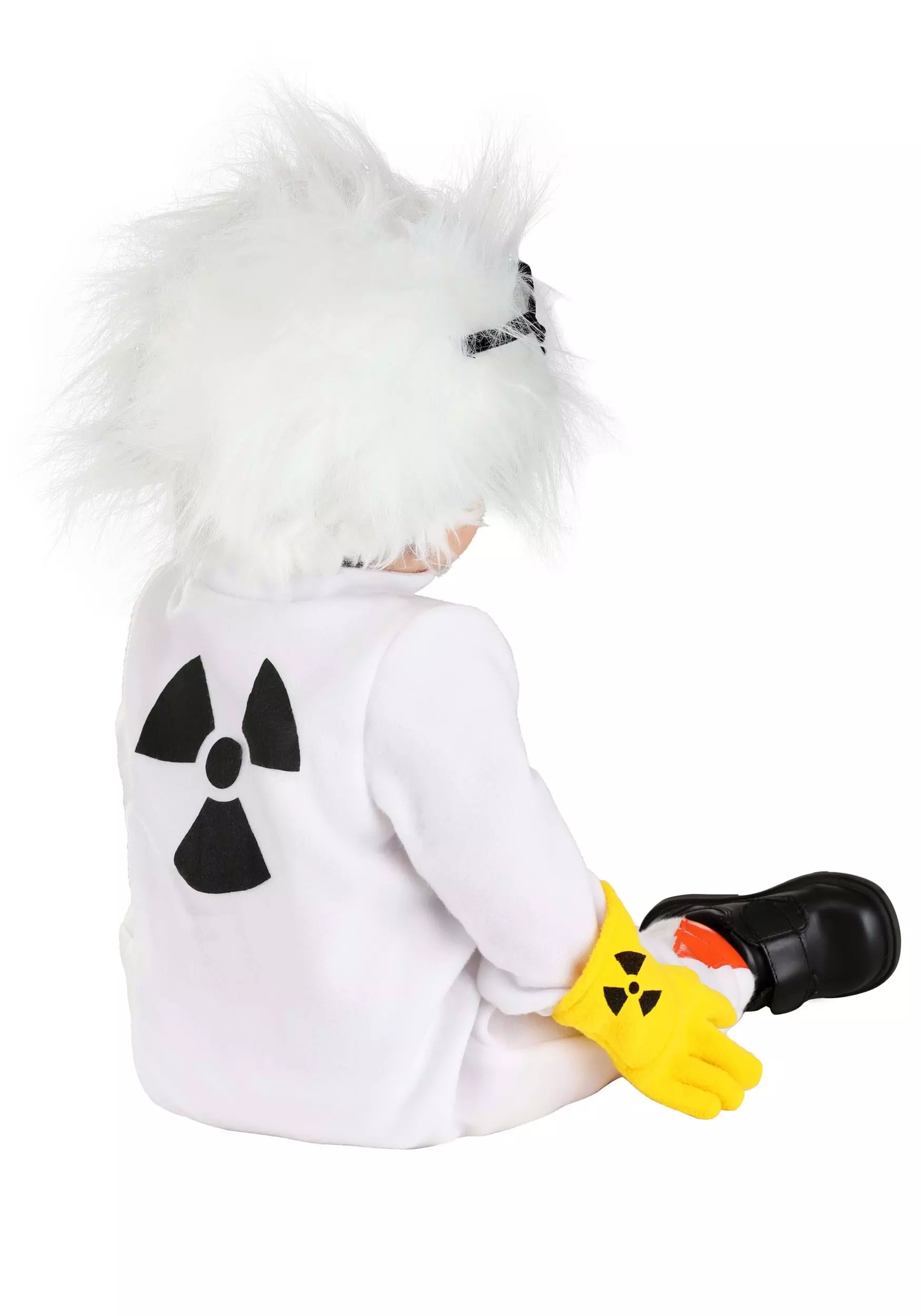Great Scott! It looks like Doc turned the dial back too far on the time machine! He appears to be much younger than he was back in the future of 1985. That won’t be a problem because he was clearly super intelligent even as a baby! Maybe this time you can be the one to help Doc Brown pave his way into the future! There’s no time to waste! Get your little one into this officially licensed Doc Brown Costume for Infants and get him into the DeLorean (or stroller) so that he can save the day! The exclusive jumpsuit is designed to look like the iconic scientist’s lab suit. It fastens up the front and along the crotch and inseams. It looks perfect when paired with the yellow gloves (with printed radioactive symbol on each cuff). A white faux fur wig decorated with black felt eyeglasses completes the look. Slip on the wild wig, and you’re ready for adventure!