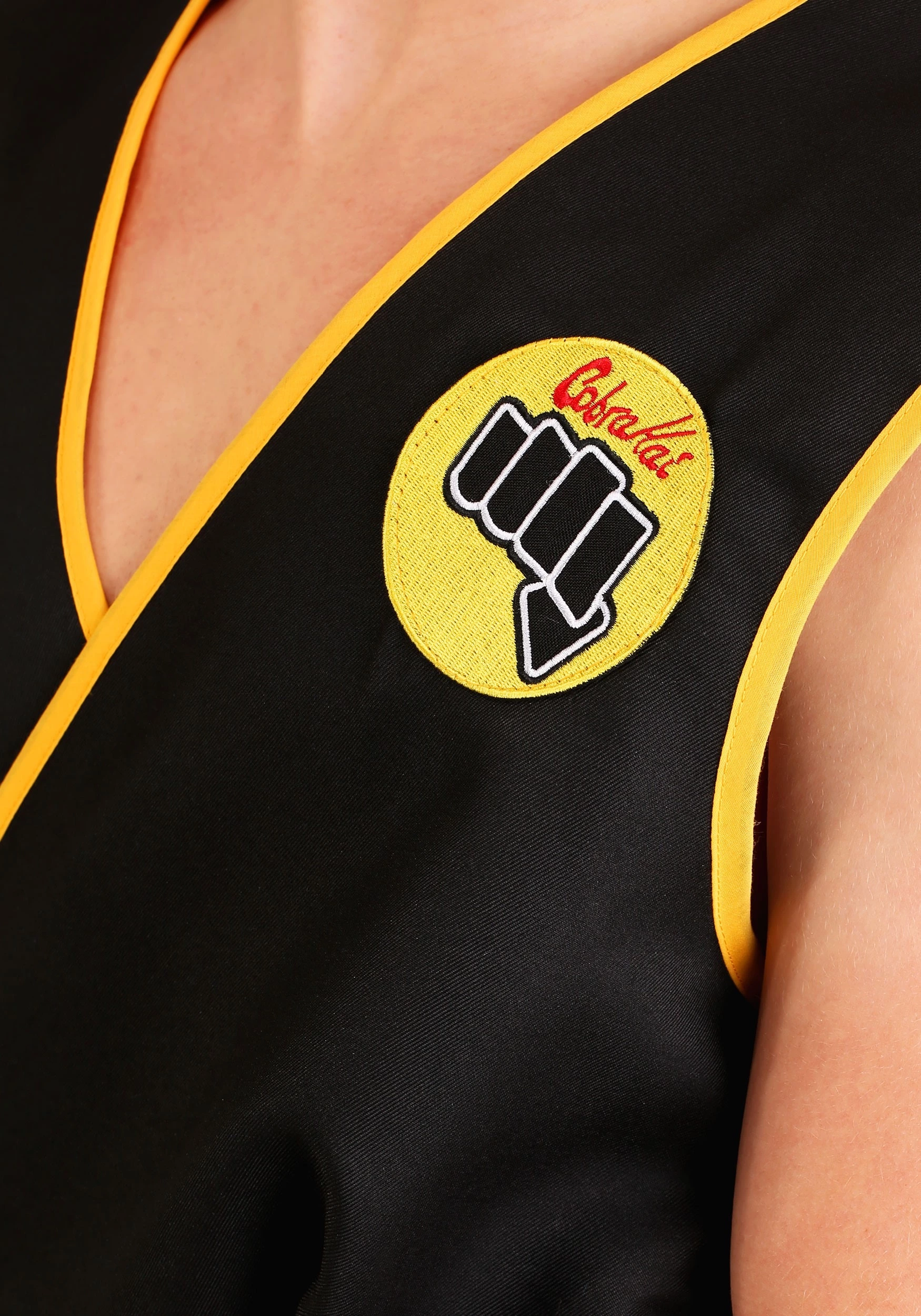 - Embroidered Cobra Kai patches on front and back of shirt