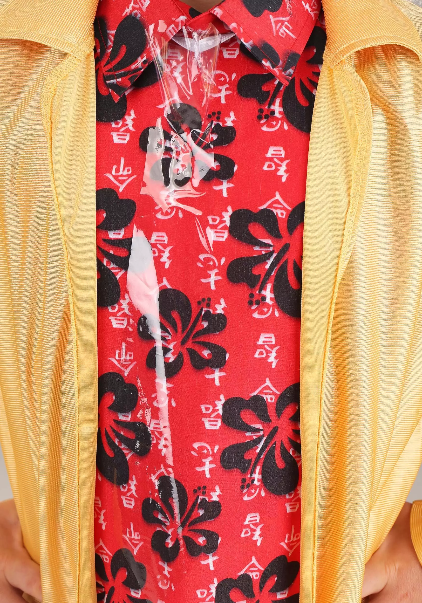 - Hawaiian print shirt front has ribbon waist ties, hook & loop strip at back of collar