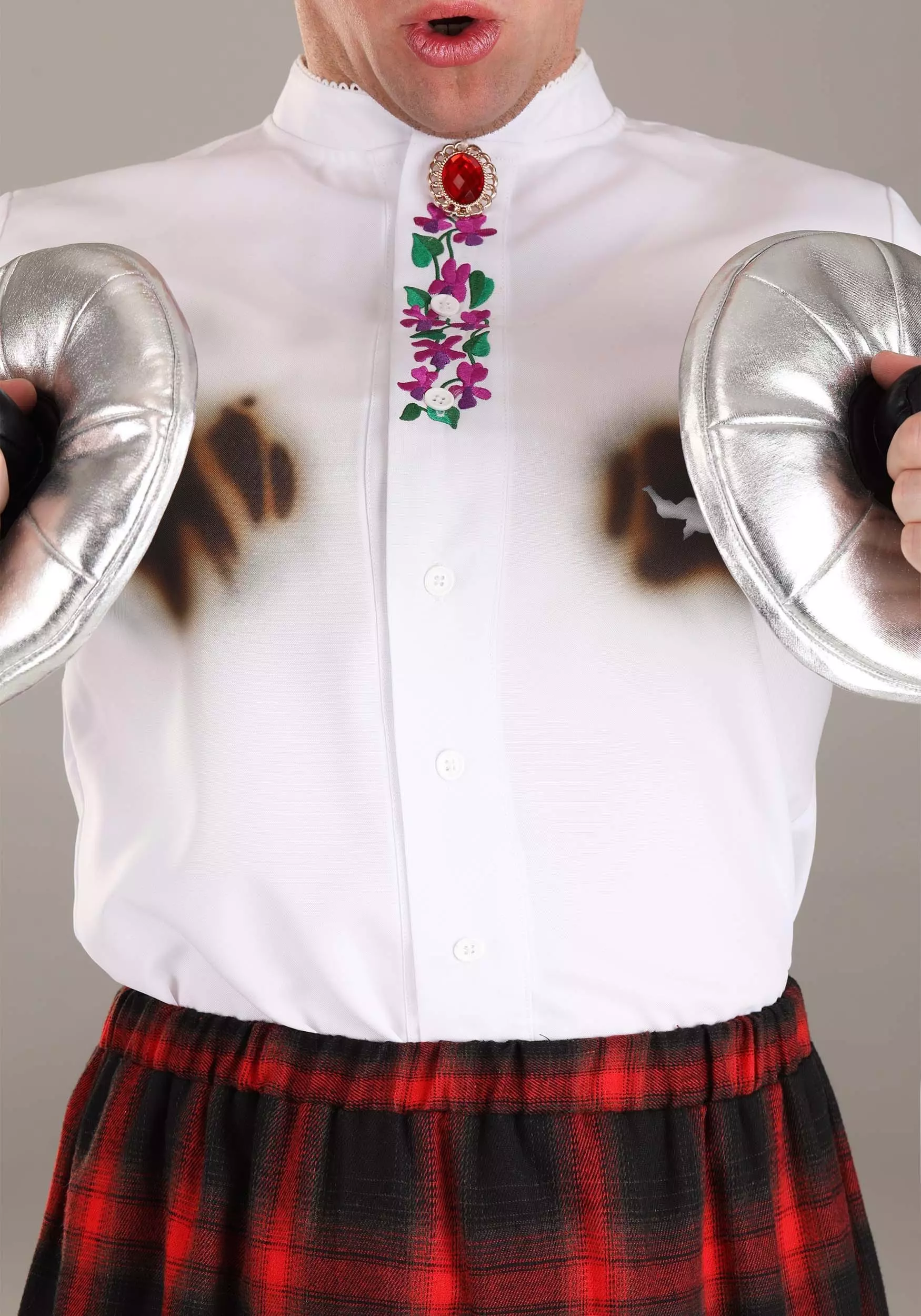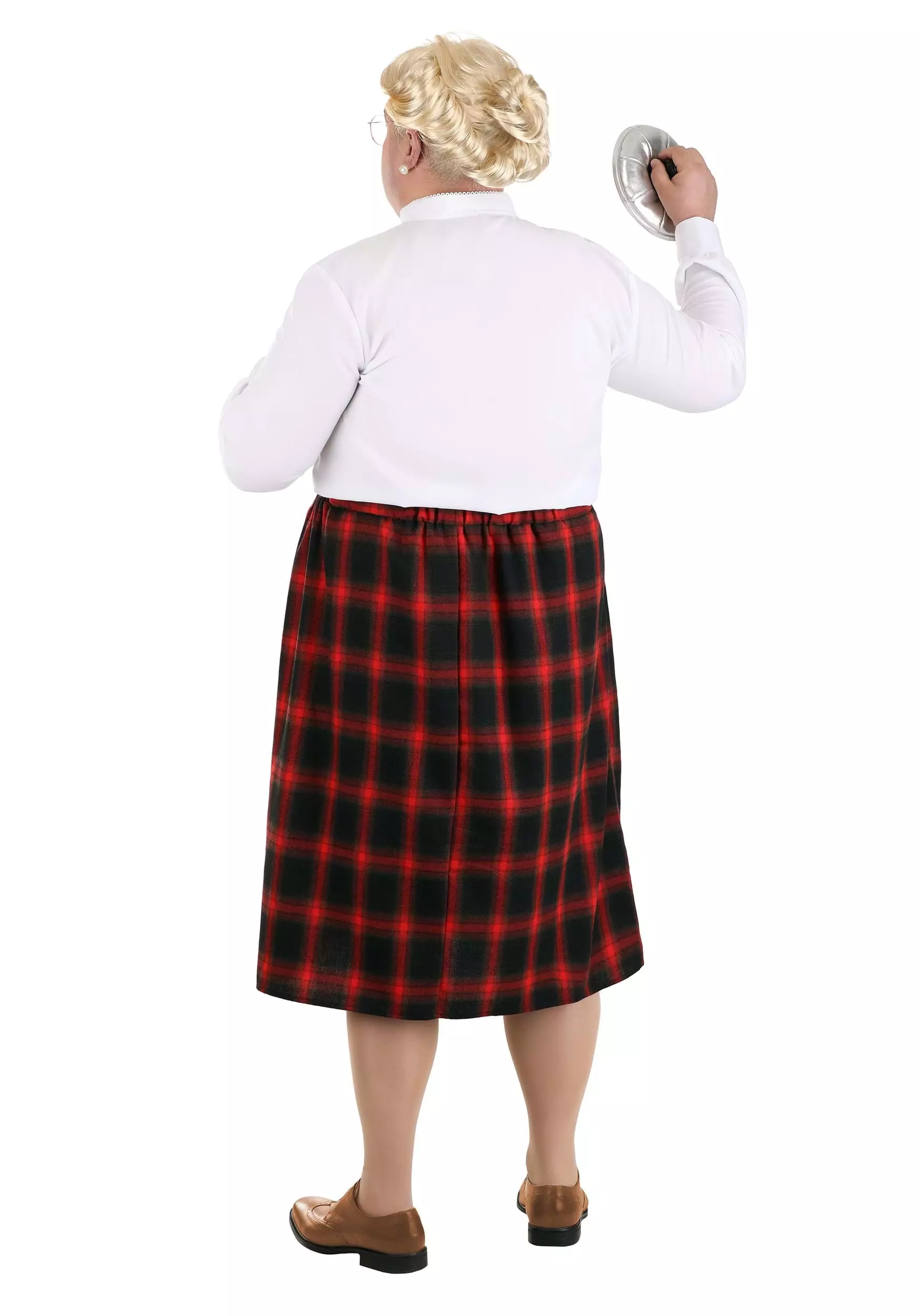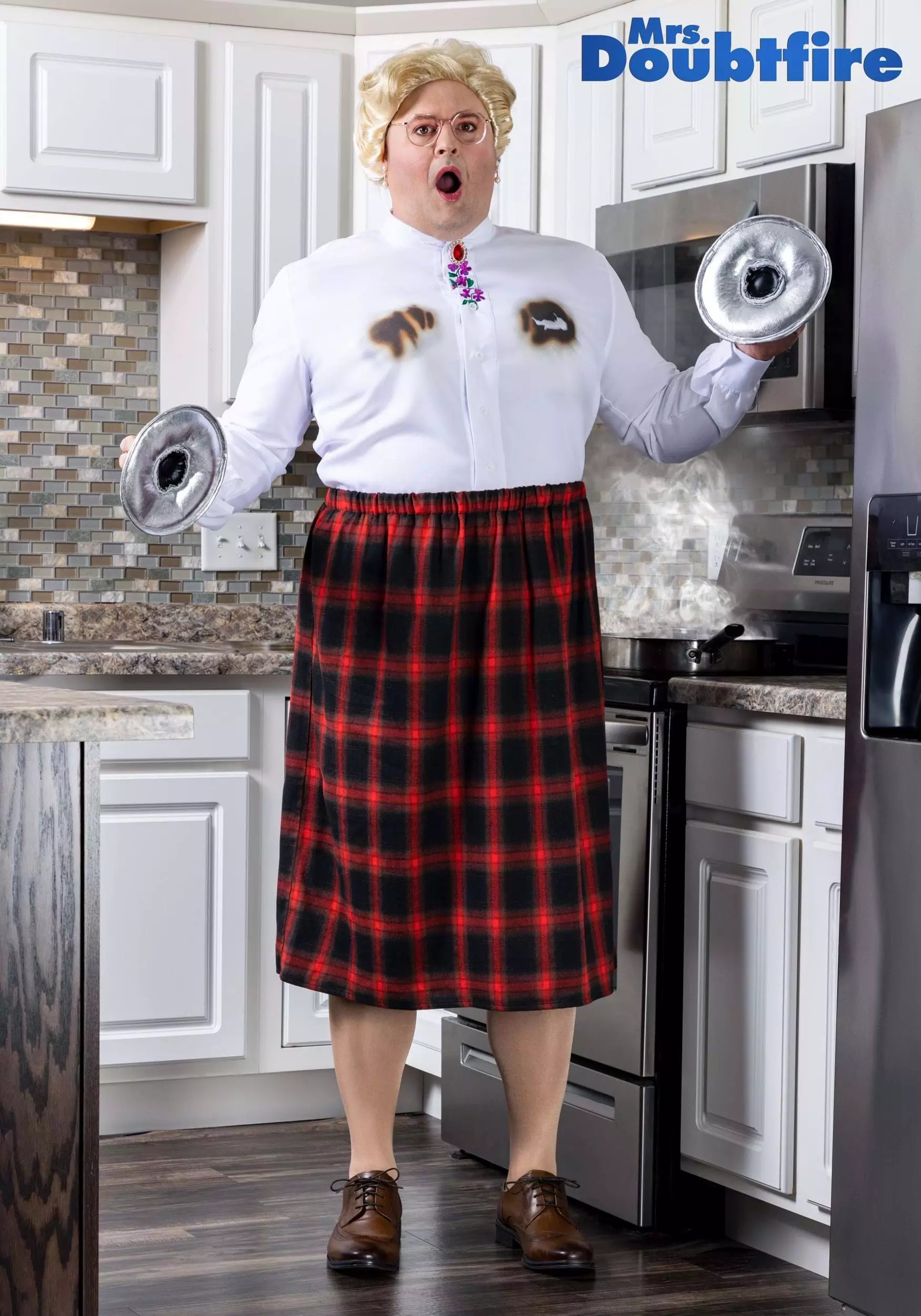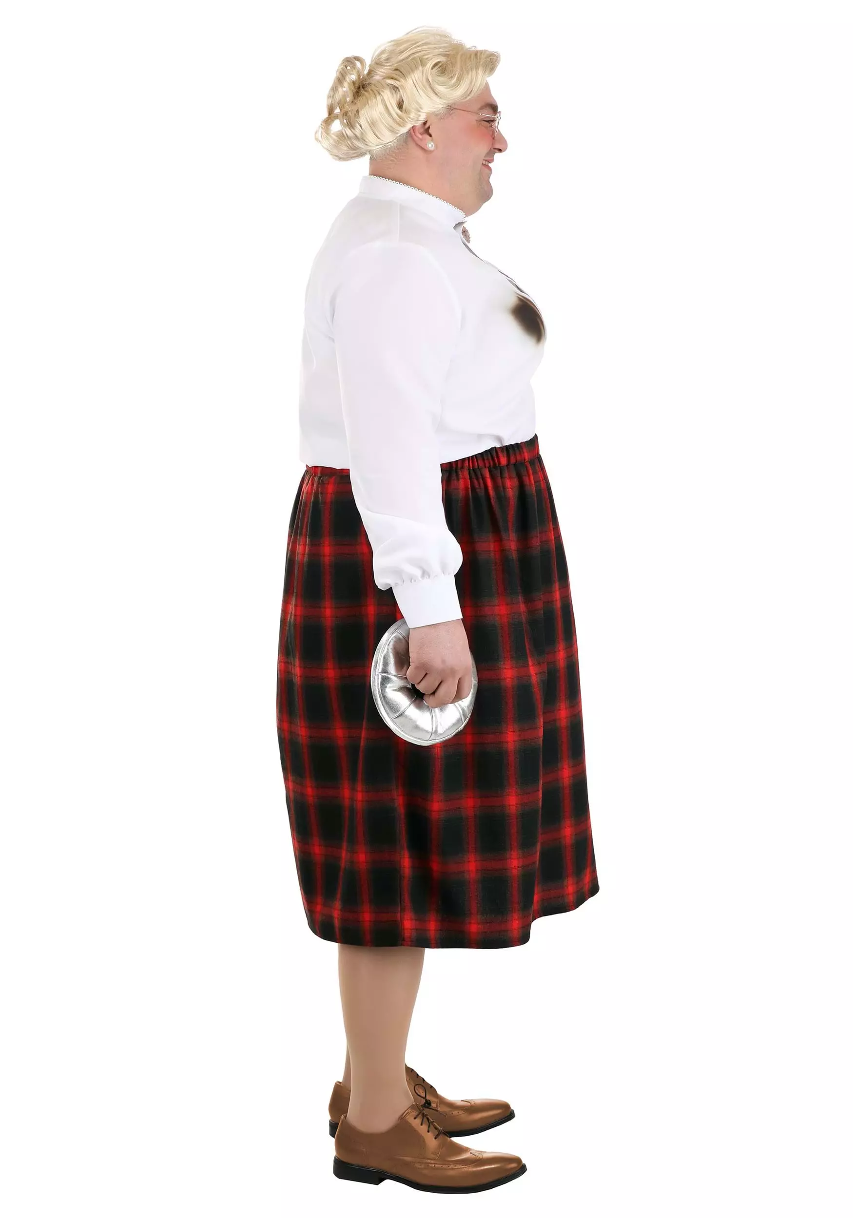 Speed things up and achieve your grandparent dreams with our exclusive Mrs. Doubtfire Plus Size Costume! Inspired by the character that had a big impact on so many minds, this officially licensed ensemble gets you wrapped up in her charms again. First, the padded bra gives the costume shape. Next, a white long-sleeved blouse with floral embroidery, lace, and printed burns give life to Doubtfire’s perfect combo of ladylike composure and chaos. Then, a tartan plaid skirt help keep the blouse tucked neatly. A gray-blond wig styled after Mrs. Doubtfire’s signature hairdo pairs with wire-rimmed glasses to give you proper grandma hair and twinkling eyes. Finally, a brooch is attached below the blouse collar providing a touch of grandma glitz while a pair of foam pot lids let you play up Doubtfire’s goofiness.