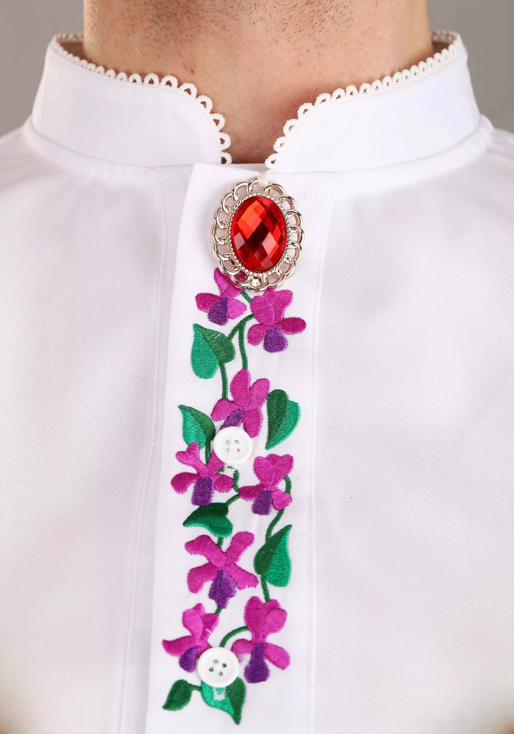 - Blouse has floral embroidery on button band, printed burn marks, lace edging on stand-up collar, plastic faux gem brooch attached at top of button band