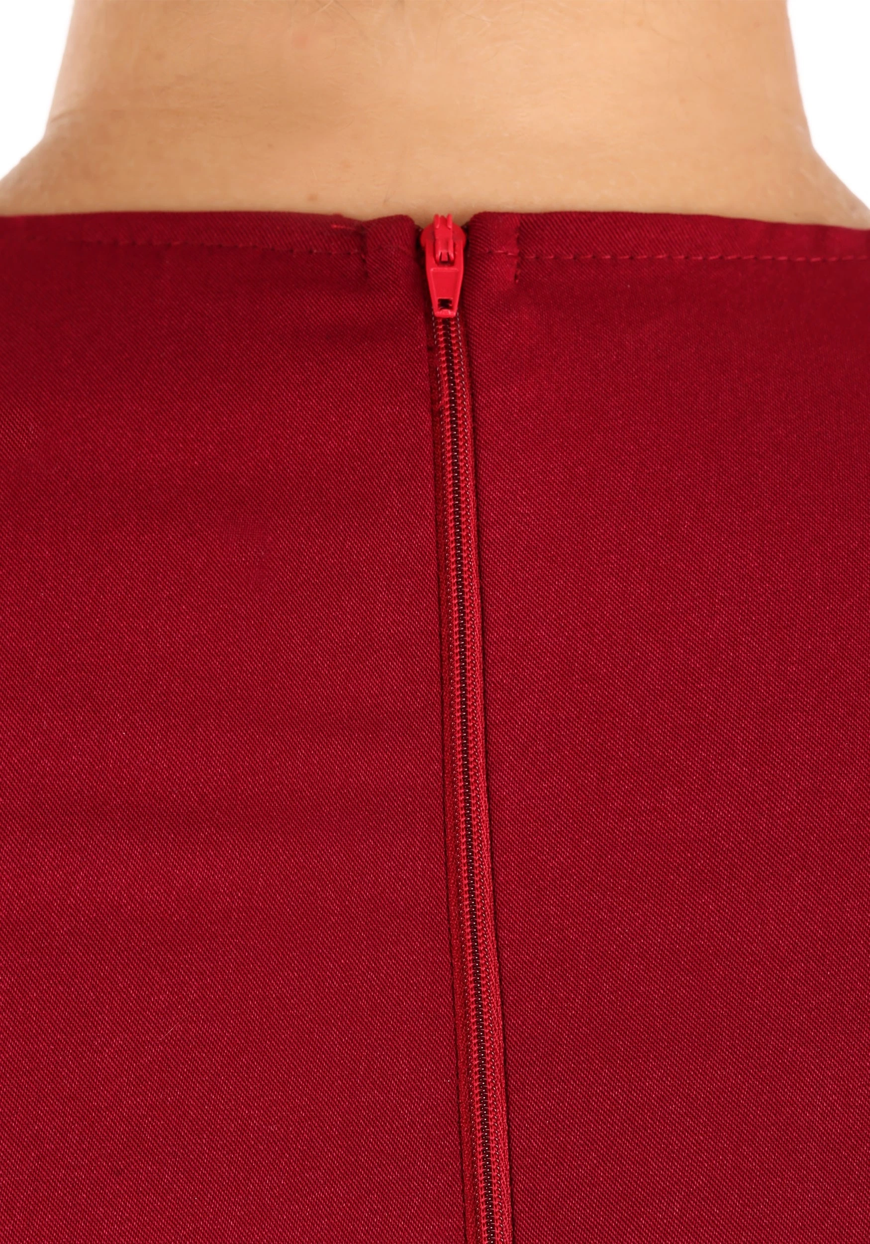 - Gabardine dress has back zipper, fitted bodice, gathered skirt