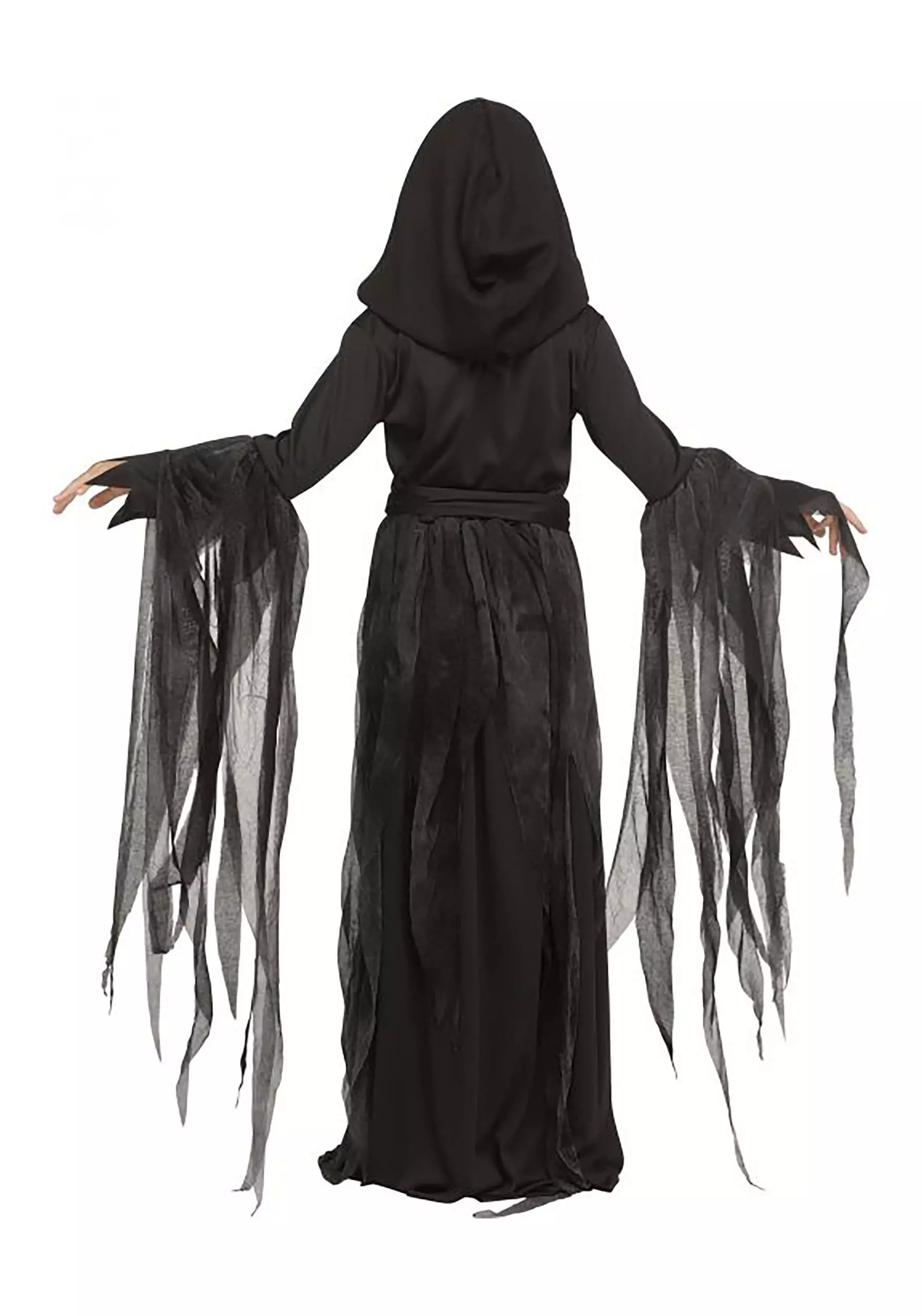 Become an unusually stylish nightmare when you wear this Girls Soulless Reaper Costume! The long black dress features a tattered-looking overskirt and long mesh streamers on each sleeve. The bodice, sleeves and skirt are printed with crimson splatter marks that resemble blood. Black gloves conceal your human hands. The gown’s waist is tied with a black sash and the attached hood can be pulled up to help conceal your face. Grab your weapon of choice and you’re ready to go!