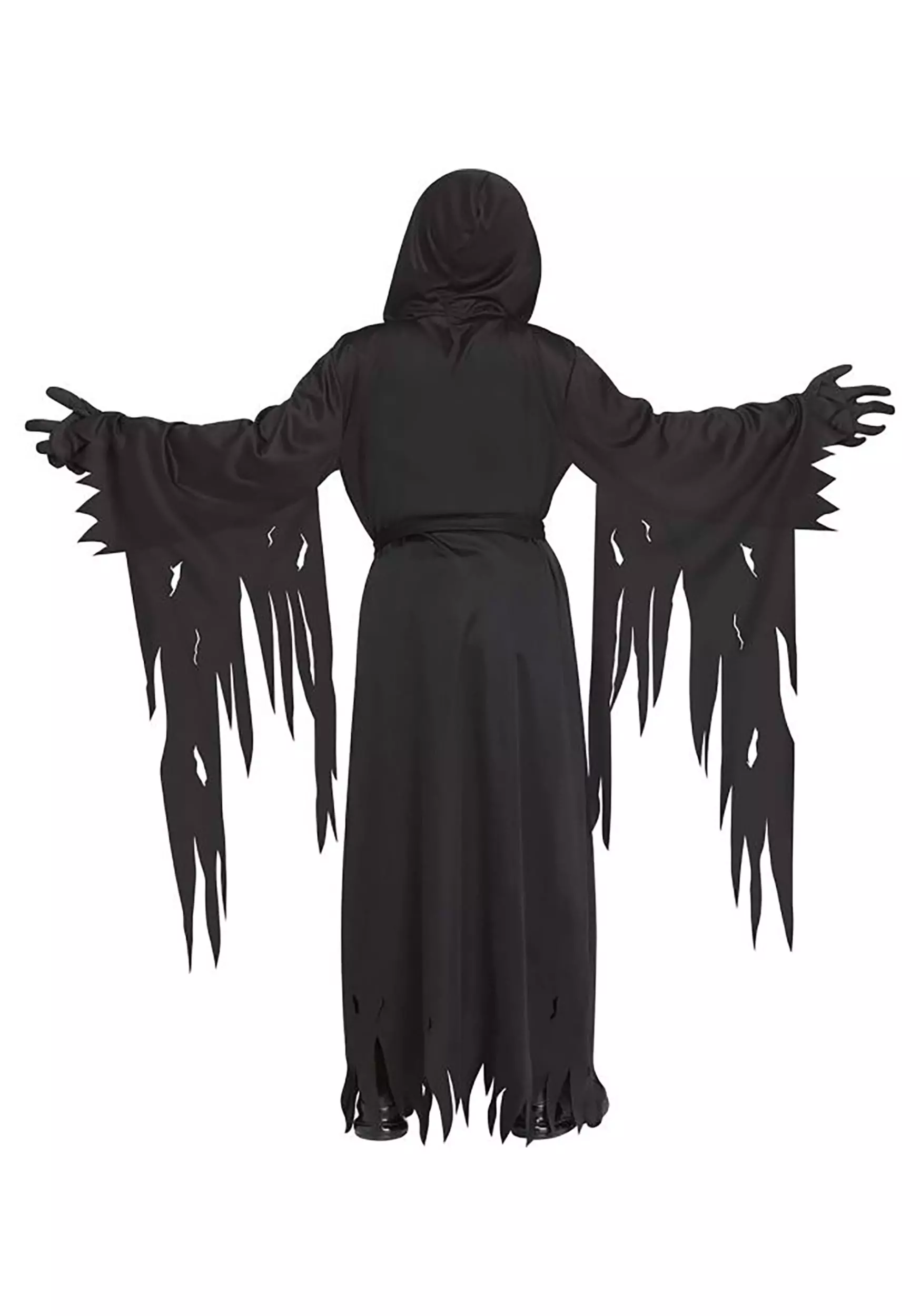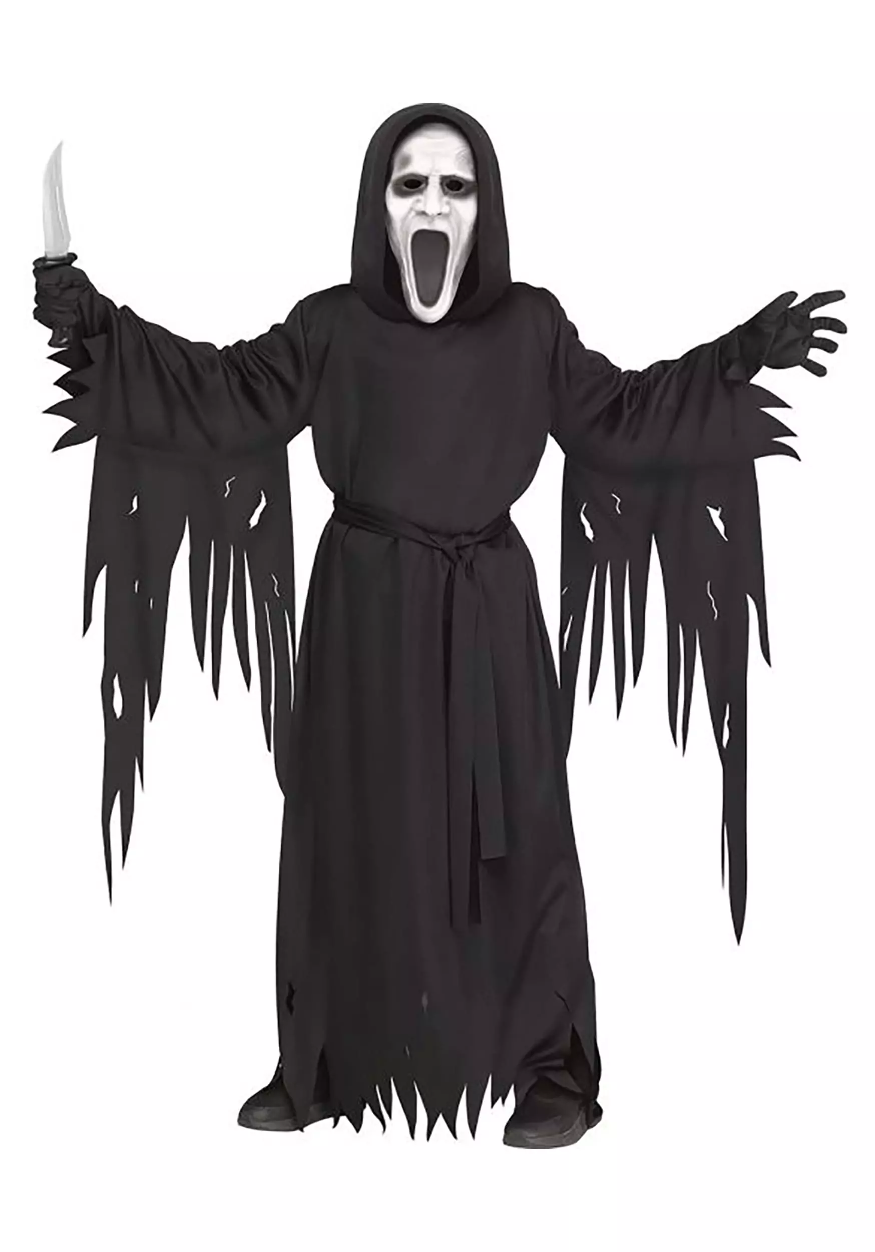 Put on this Silent Screamer Costume for Boys and listen for the shrieks! The outfit includes an ankle-length black robe with a slashed hemline. Its long sleeves have tattered, irregular streamers that are long near the wrists and shoulders and shorter near the elbows. A same-fabric belt can be tied around your waist as desired. Pull up the attached hood to conceal the back of your head. The white vinyl mask will hide your entire face. The area around its eyes is colored a dark gray, and its mouth is open in a sinister scream!