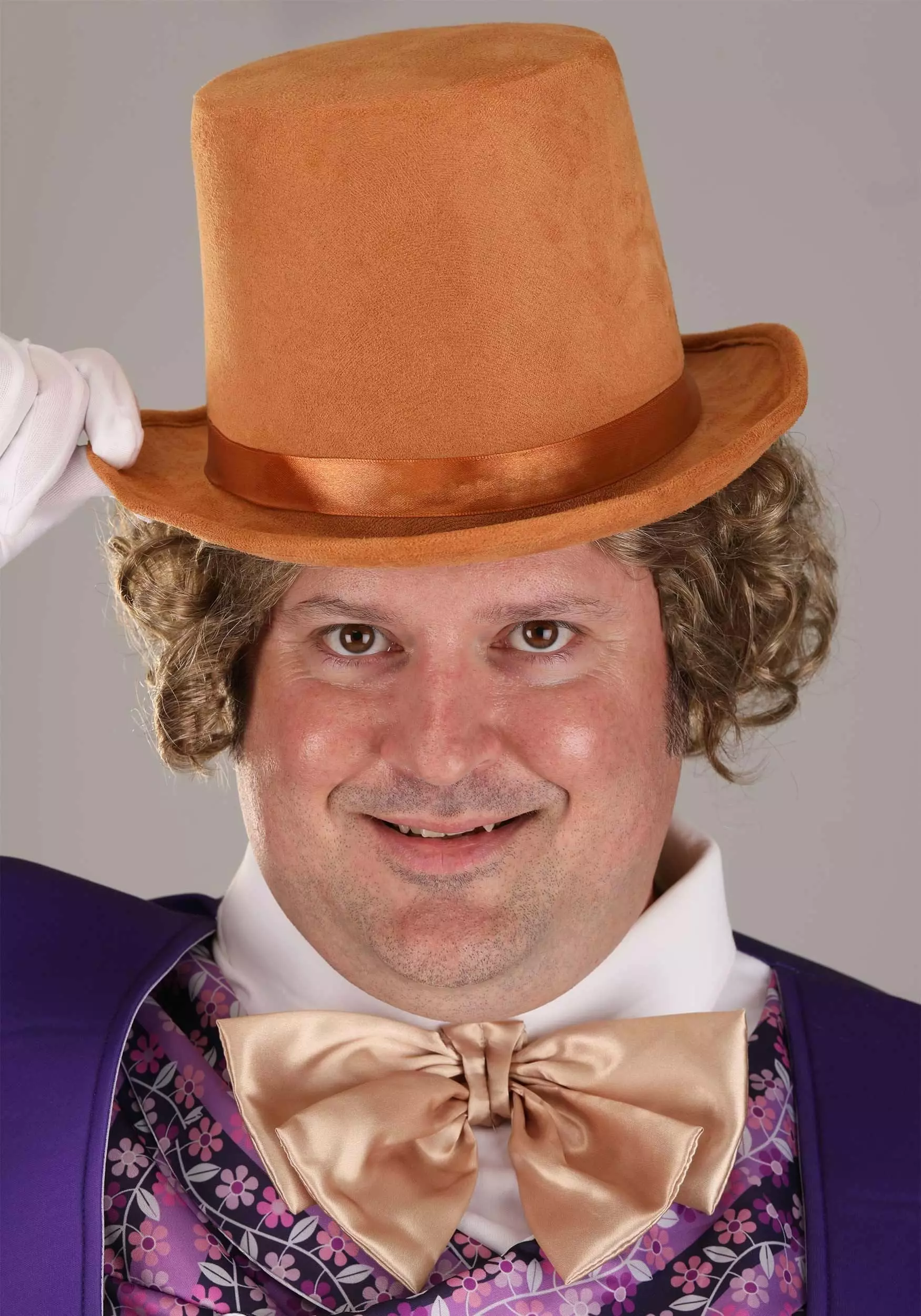 You’ll be a showstopping figure in your officially licensed, exclusive Plus Size Willy Wonka Costume for Men! The outfit includes a long jacket made of deep purple jersey knit with wide lapels. The printed purple shirt front attaches to the inside of the jacket via hook and tab strips. The foam-backed white collar is decorated with a large satin bow. Top things off with the brown faux suede top hat, which is trimmed with a matching ribbon. Bring your favorite walking stick so that you can do a fancy somersault at the big reveal!
