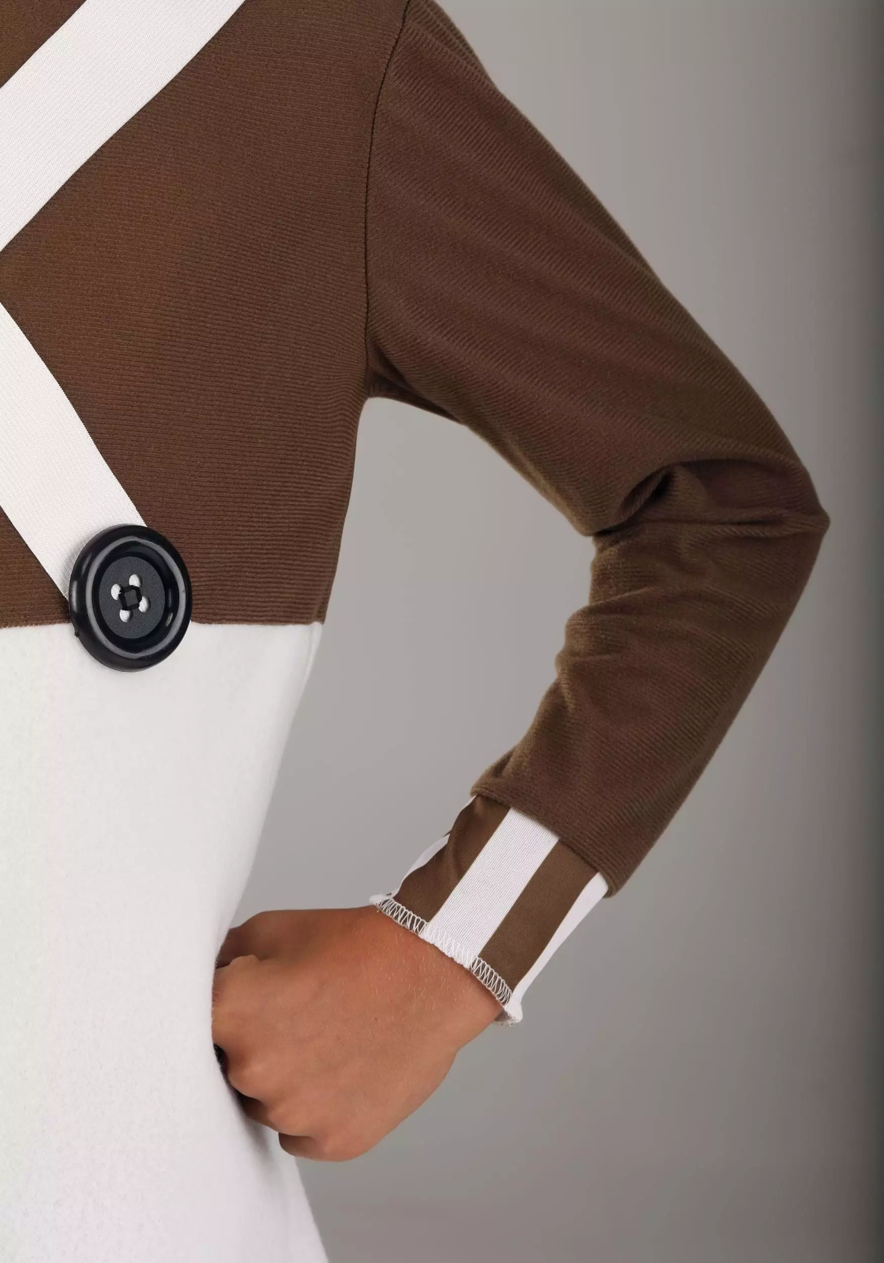- White fleece bottom w/ sewn in brown top, jersey knit sleeve cuffs and collar