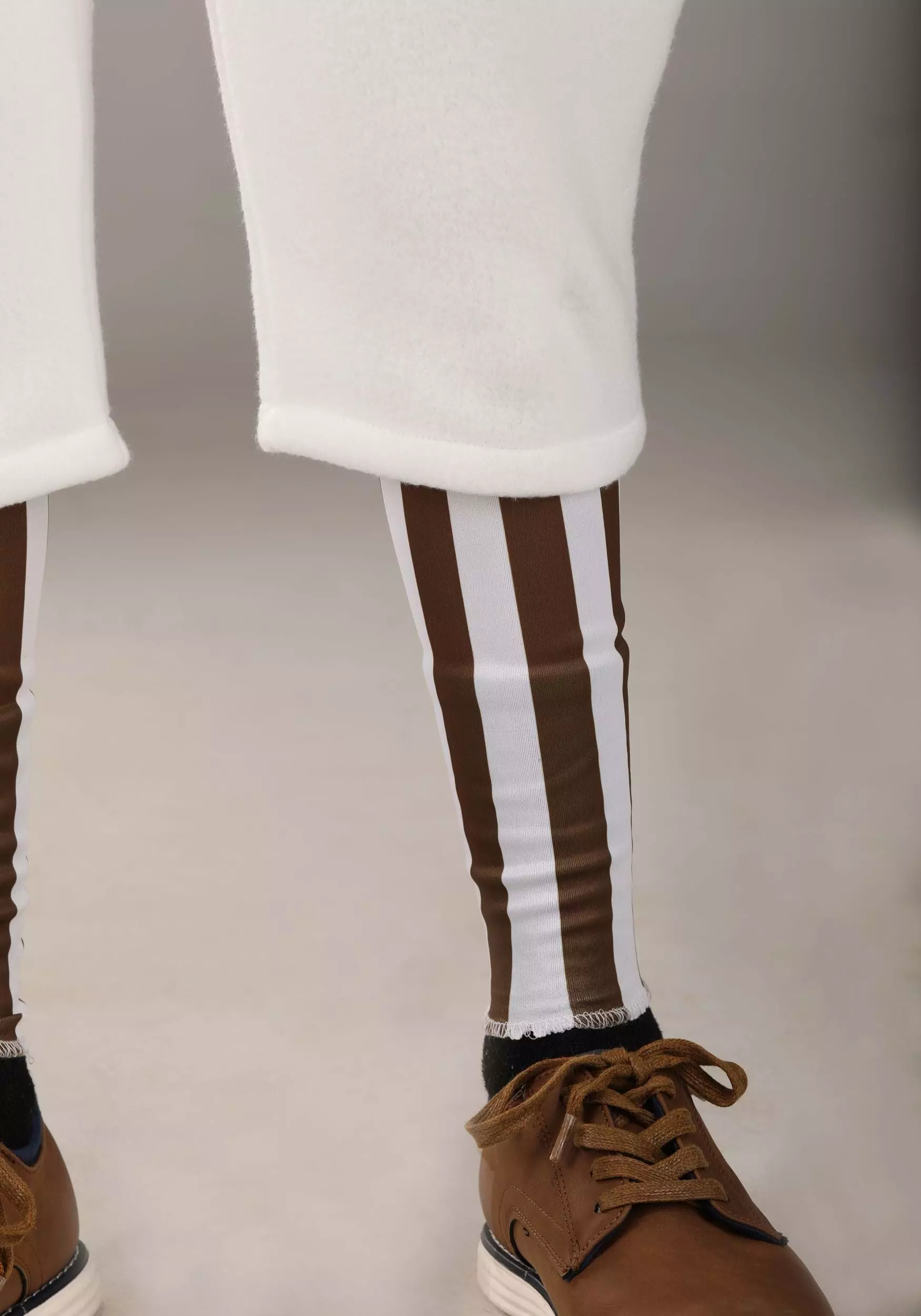 - Jersey knit striped leg warmers have elastic bands to secure on legs