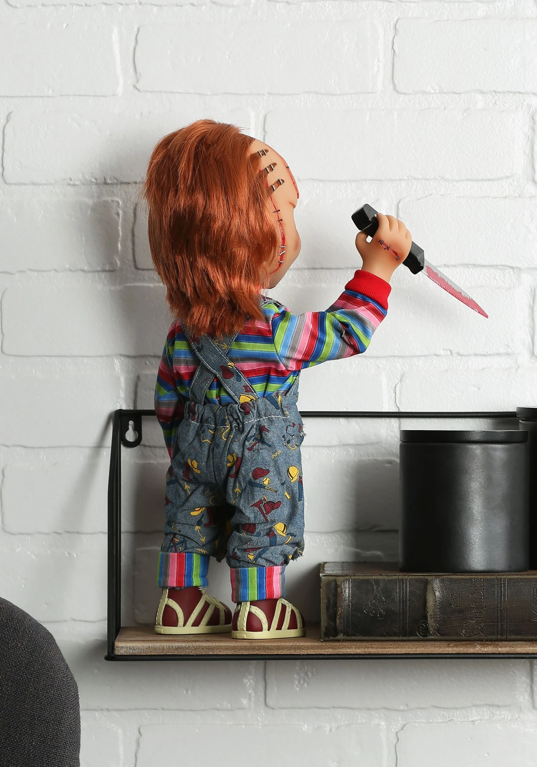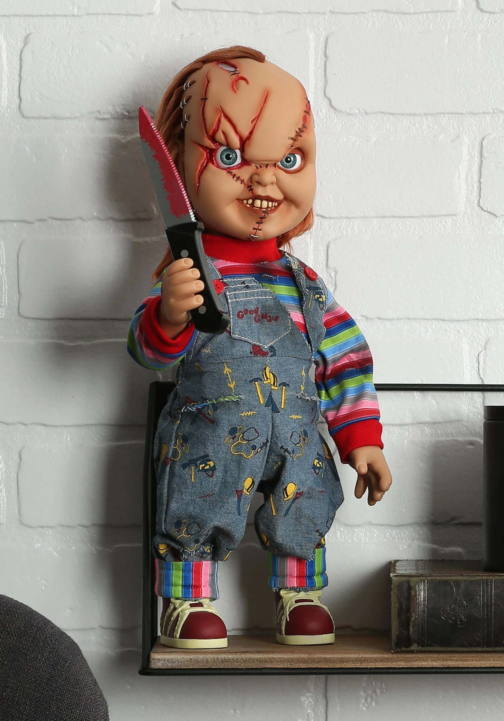 The officially licensed 15-inch doll is poseable with 11 points of articulation. When squeezed, the doll speaks 7 popular movie phrases. Covered in stitches and scars, the Chucky doll is holding a plastic knife, ready to snatch a soul.