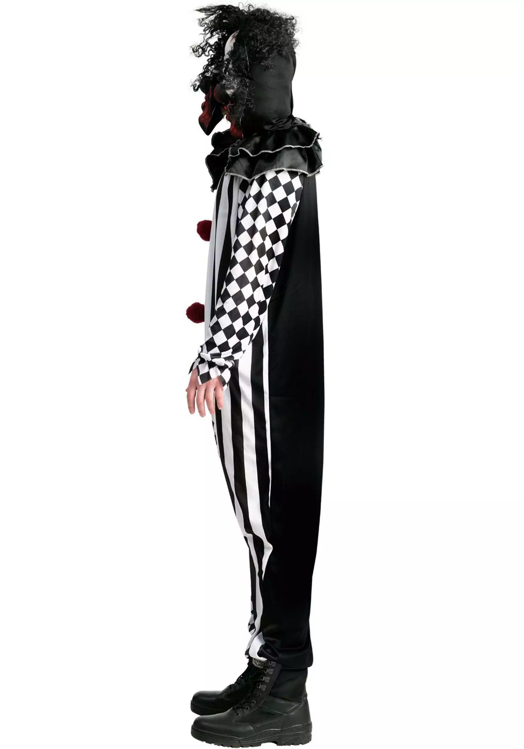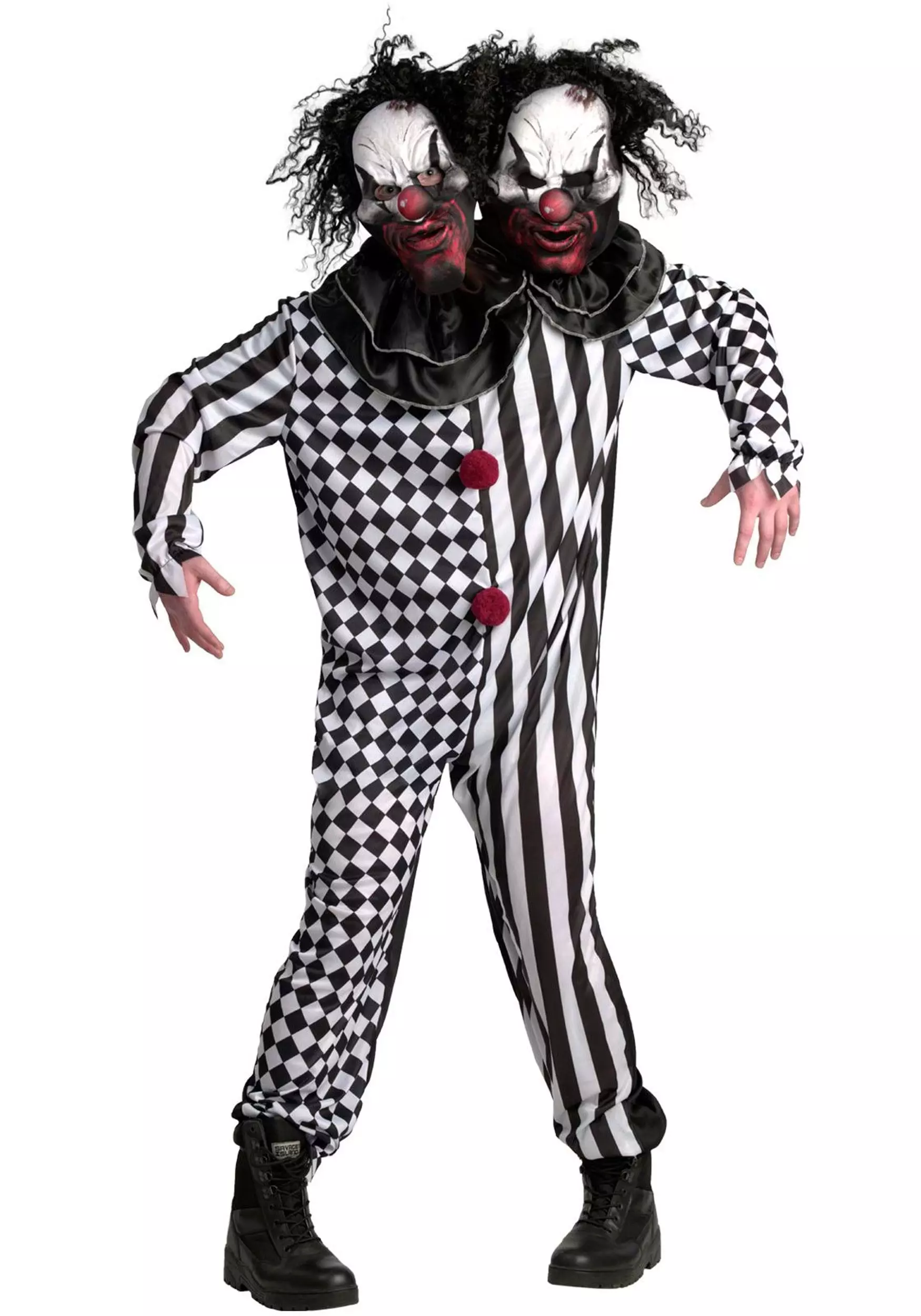 The Circus of Horrors is in town when you wear your Two-Headed Clown Plus Size Costume for Adults! The outfit includes a one-piece jumpsuit that fastens up the back. One half is printed with black and white stripes, while the other half is printed with a pattern of black and white diamonds. A column of three red pompoms is sewn to the center of the torso. A stuffable clown head is attached to the left shoulder and features a ruff around its neck that’s the same as the one sewn to your own collar opening. A matching clown mask with synthetic hair is attached at the center.