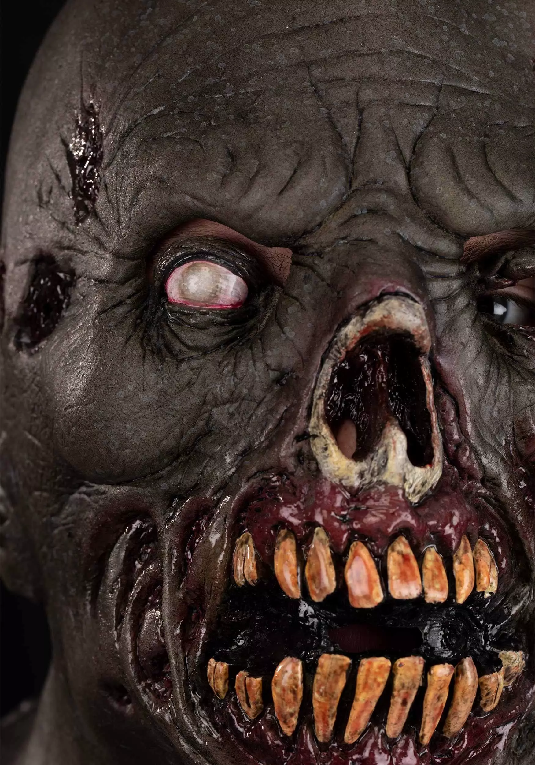 Have the grossest costume you can dream up when you wear this Stench Zombie Mask for Adults! The molded accessory covers your entire head, neck, and upper chest, and is painted to look like a snarling zombie with yellowing teeth, rotting skin, and visible rib bones.