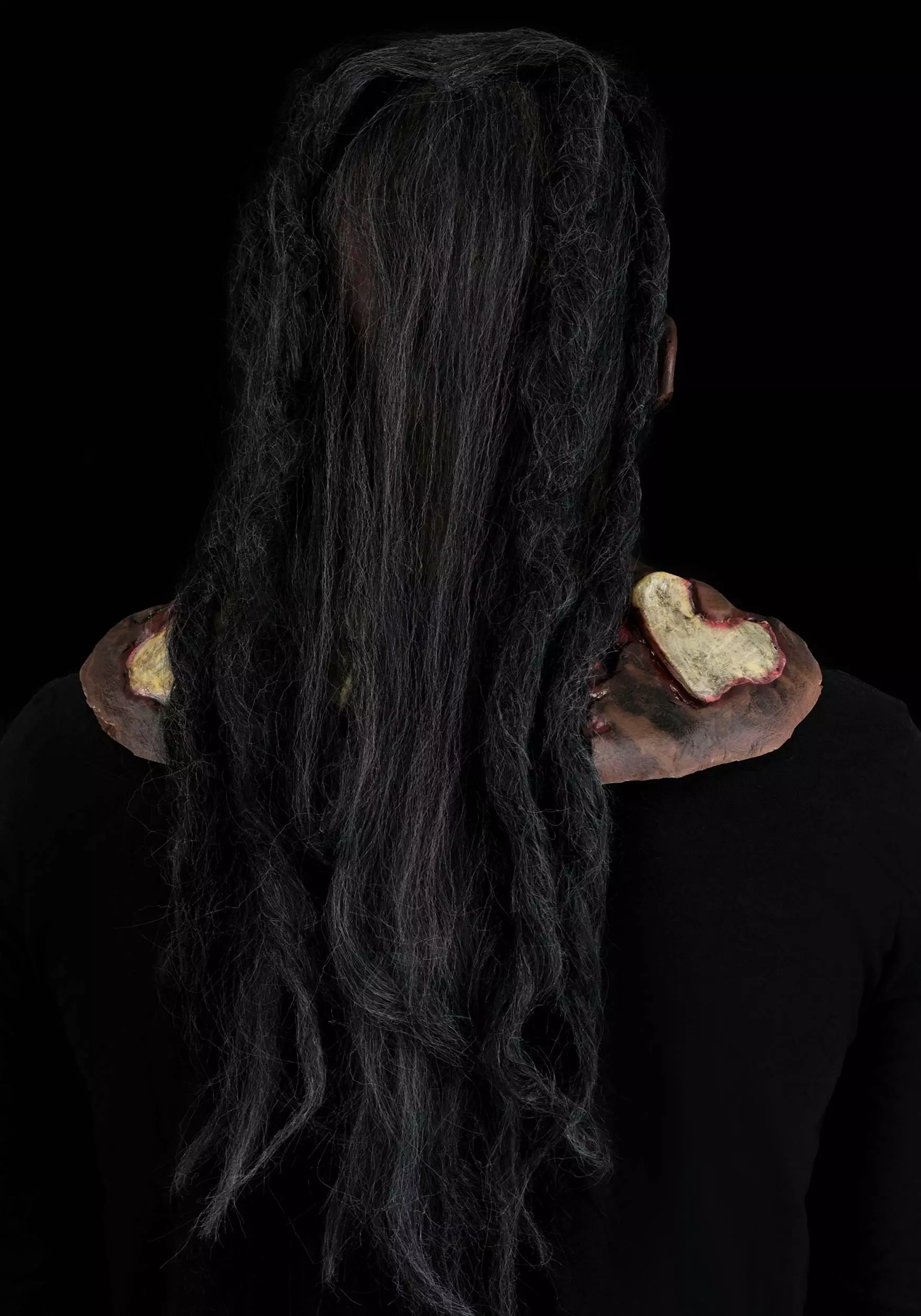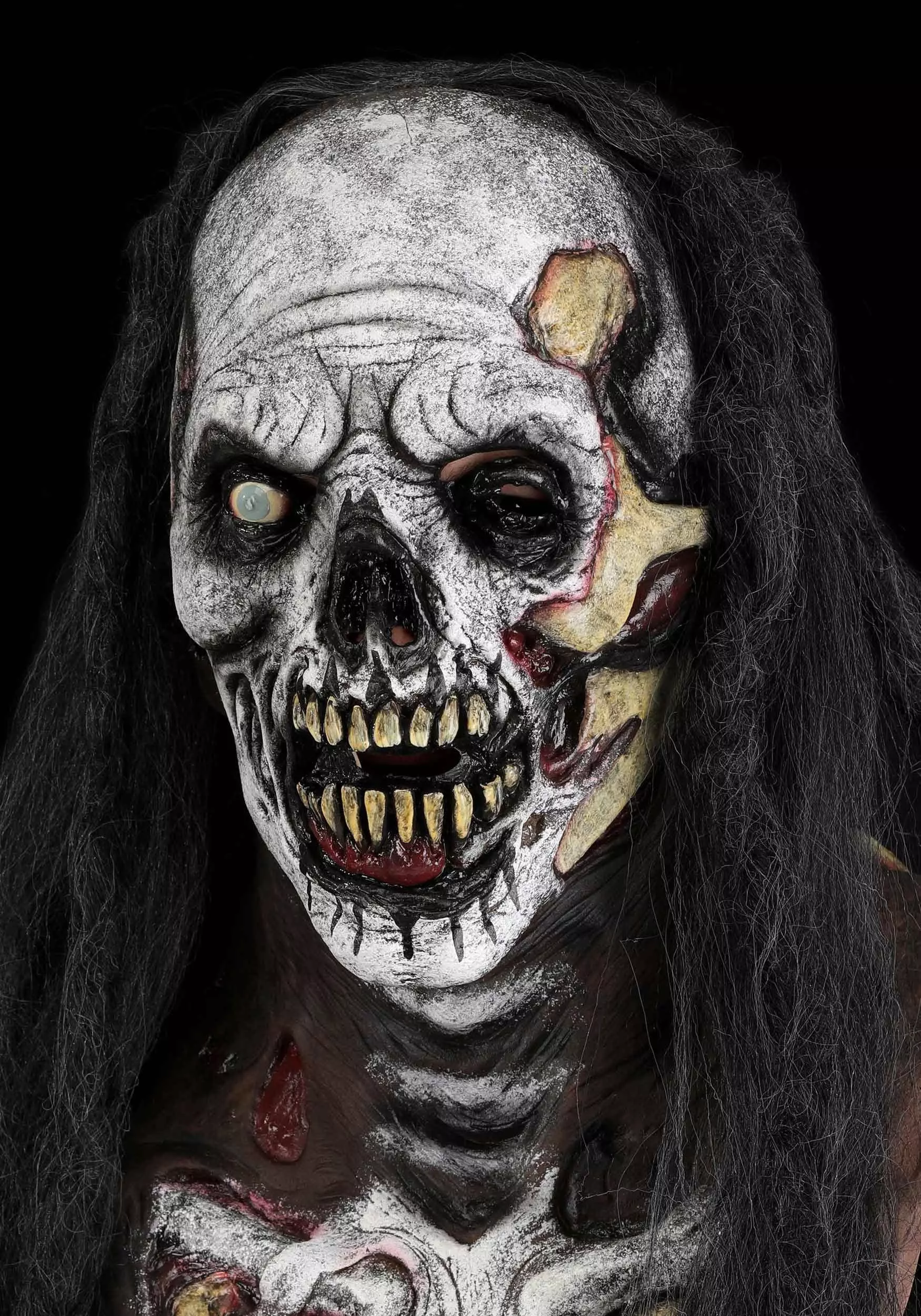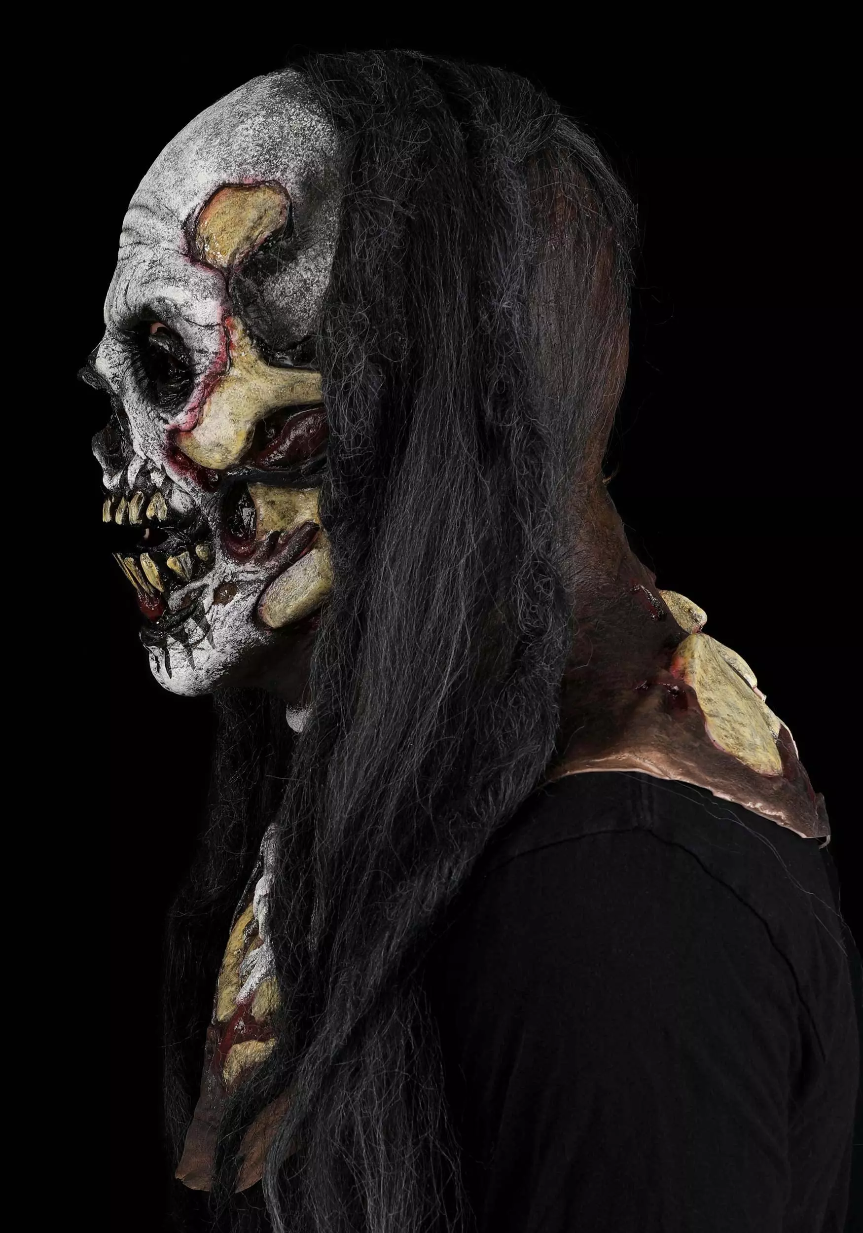 Go for the full gross-out effect in this Voodoo Zombie Mask for Adults! The mask covers your entire head, neck, and upper chest, with hidden viewing ports so that you can (sort of) see where you’re going. It’s molded to look like a snarling, skeletal zombie with rotting grayish skin and one missing eye. Long, synthetic black hair is attached to the back and sides.