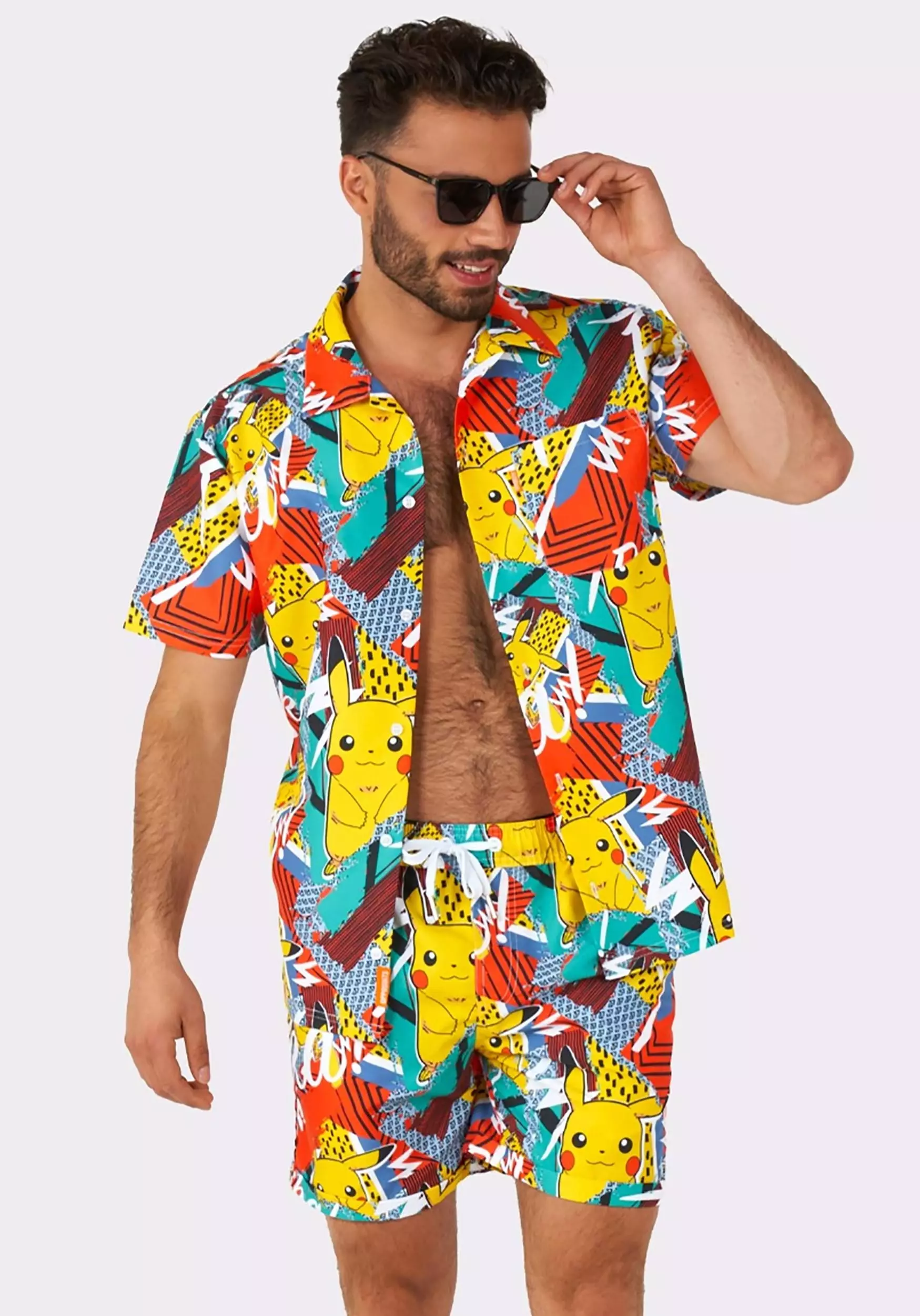 This outfit is made of 100% polyester peach fabric. Pikachu and a multitude of fun patterns are printed all over the shirt and trunks. The shirt has a button-down front. There is an adjustable waistband around the shorts. The shorts have side pockets and a back pocket. It is designed with a modern tailored fit.