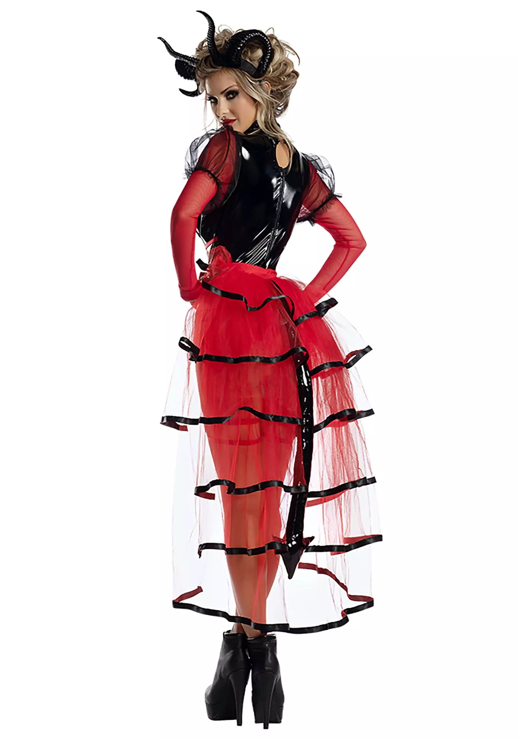 If you’d like to explore a different kind of demonic outlook on life, try this Sexy Hellhound Demon costume on for size! This bodysuit has a shiny faux leather look and sheer red sleeves to truly captivate your demonic side. The back features a zipper for fit and a circle cutout for a bit of extra sass. Puffy tulle in black and red detail the sleeves and the beautiful train at the waist. Black and red ribbon create a captivating harness and demon tail and the horned headpiece serves as your worthy crown. Claim your place on Earth and paint the night red (with brimstone)!
