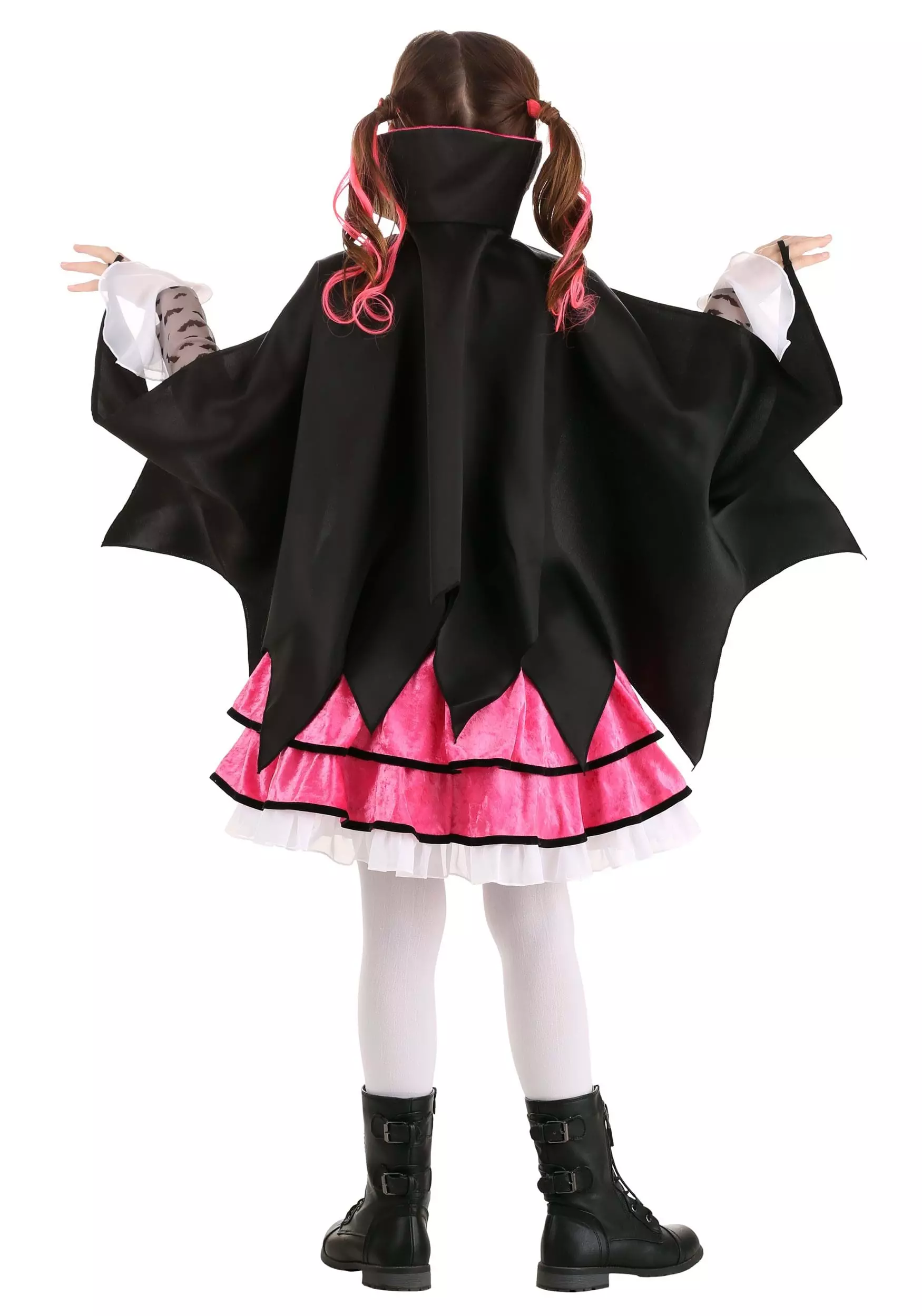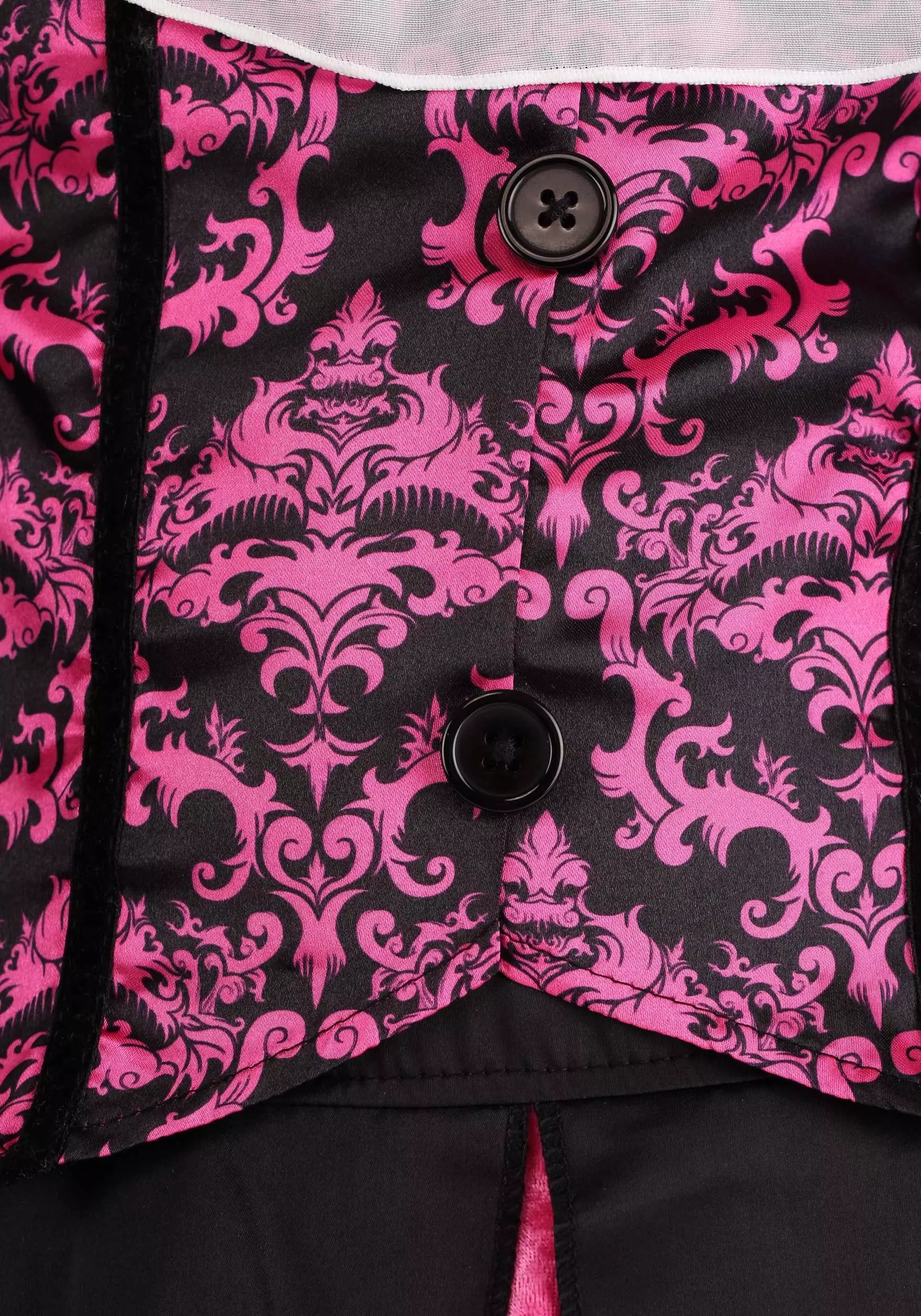 Your favorite little ghoul will howl with excitement when she wears this exclusive Pink Vampire Costume! The dress is a delighful mix of old fashion made new, with a pink and black brocade-detail waistcoat attached to a shimmery pink skirt. A frothy white collar with an accent bowtie is the last word in sophistication. The sheer black sleeves are printed with whimsical flying bats. And speaking of bats, this vampire princess has an amazingly floaty black bat cape that flutters behind her with every movement. She’ll be the sweetest sight at the Monster Mash ball!