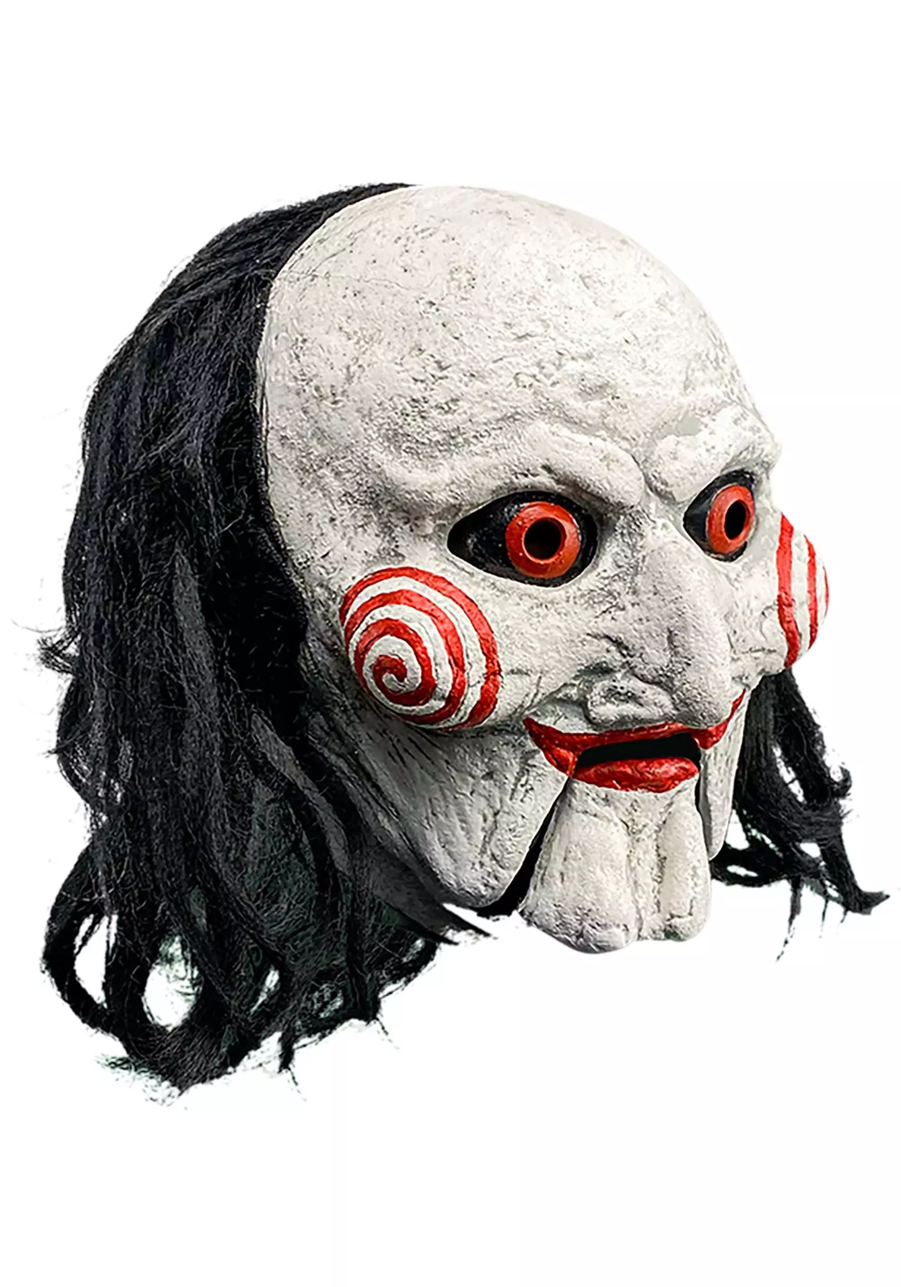 Let everyone know the details of their murderous game-slash-trap when you wear an officially licensed Billy with Moving Mouth Mask for Adults! The molded latex mask has black faux hair and viewing ports in its red eyes. Bullseye style details on the cheeks and the papier-mache-like “skin” make it look just like John Kramer’s creepy sidekick. Secure the mouth piece around your chin to make the puppet’s mouth move when you talk.